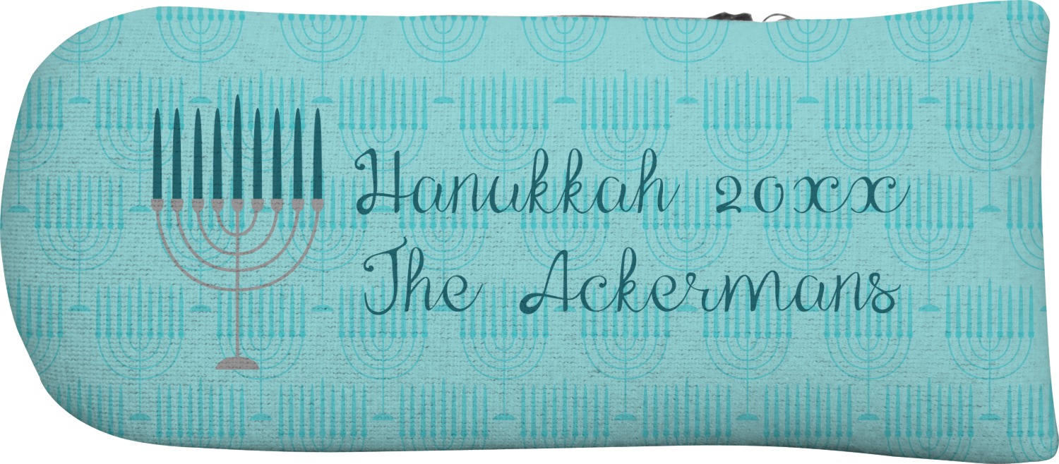The design is a beautiful set of different shades of teal. You will see three different patterns used throughout this design. One with stripes, olive branches, and stars of David, one with menoras, and the last with doves, menoras, olive branches, and stars of David. The main design has a tall frame with your personalization and a menora graphic in the middle.