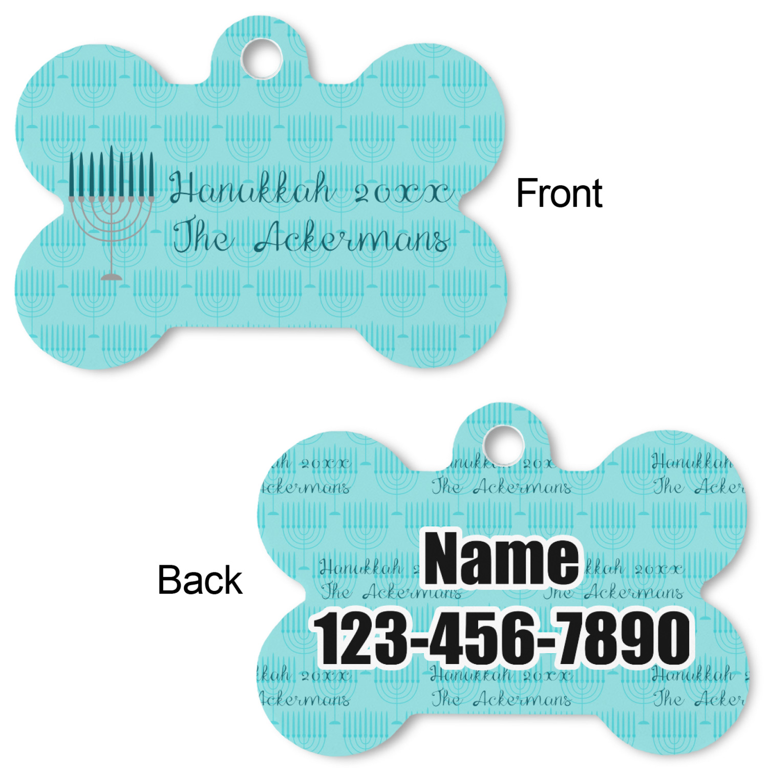 The design is a beautiful set of different shades of teal. You will see three different patterns used throughout this design. One with stripes, olive branches, and stars of David, one with menoras, and the last with doves, menoras, olive branches, and stars of David. The main design has a tall frame with your personalization and a menora graphic in the middle.