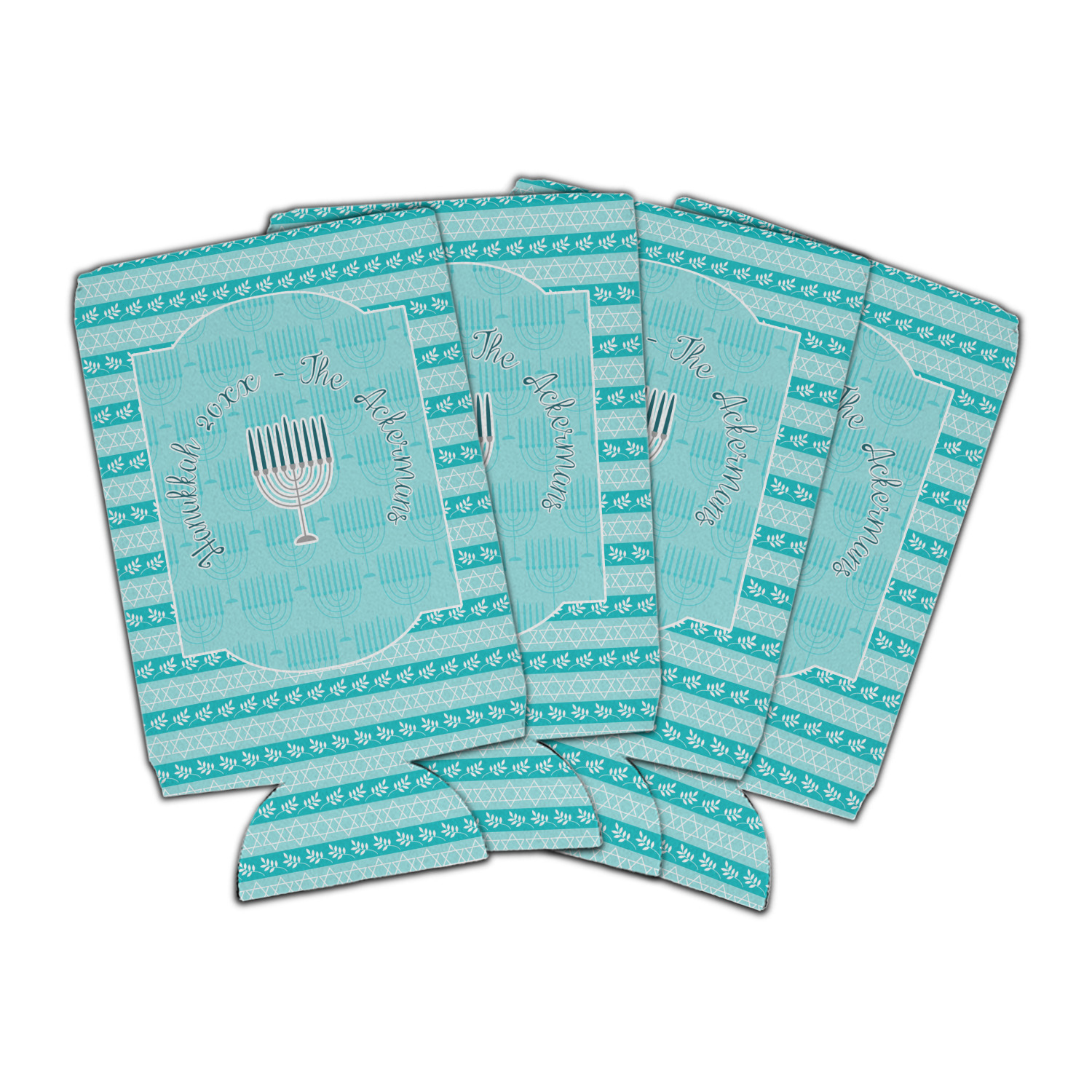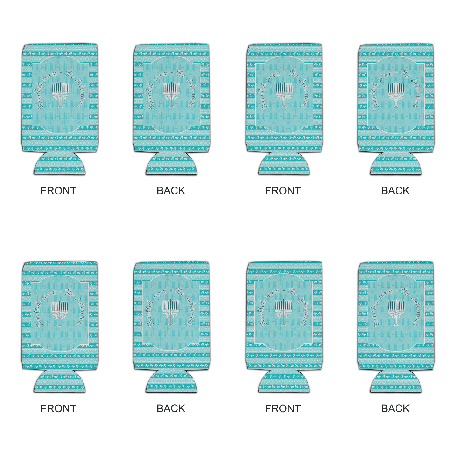 The design is a beautiful set of different shades of teal. You will see three different patterns used throughout this design. One with stripes, olive branches, and stars of David, one with menoras, and the last with doves, menoras, olive branches, and stars of David. The main design has a tall frame with your personalization and a menora graphic in the middle.