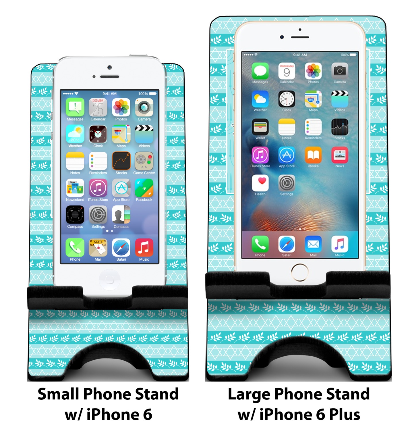 To meet your needs, we offer four variations of this IPhone stand. The backboard of the first version is shaped as a plain, yet sleek rectangle, and is available in two sizes. Our smaller size is approximately 4 by 3.25 by 7 inches, while the larger model is 4 by 3.77 by 8.5 inches. Alongside this model, we also provide you with a more decorative option. The upper part of our second version features a curved edge, for a classy, suave appearance. This phone holder is also sold in two sizes: a smaller version, which is 4 by 3.25 by 7 inches, and our larger model, which is 4 by 3.77 by 8.5 inches. Both models will support large phones, but the larger model is better if you wish to proudly display your personalized design.