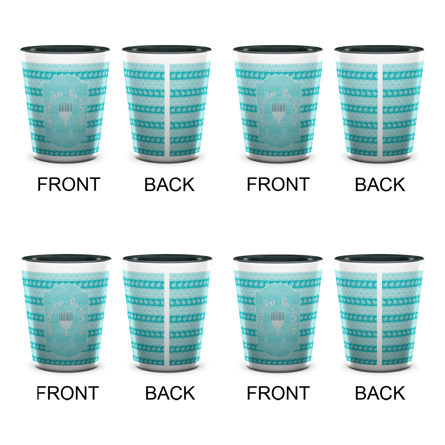 The design is a beautiful set of different shades of teal. You will see three different patterns used throughout this design. One with stripes, olive branches, and stars of David, one with menoras, and the last with doves, menoras, olive branches, and stars of David. The main design has a tall frame with your personalization and a menora graphic in the middle.