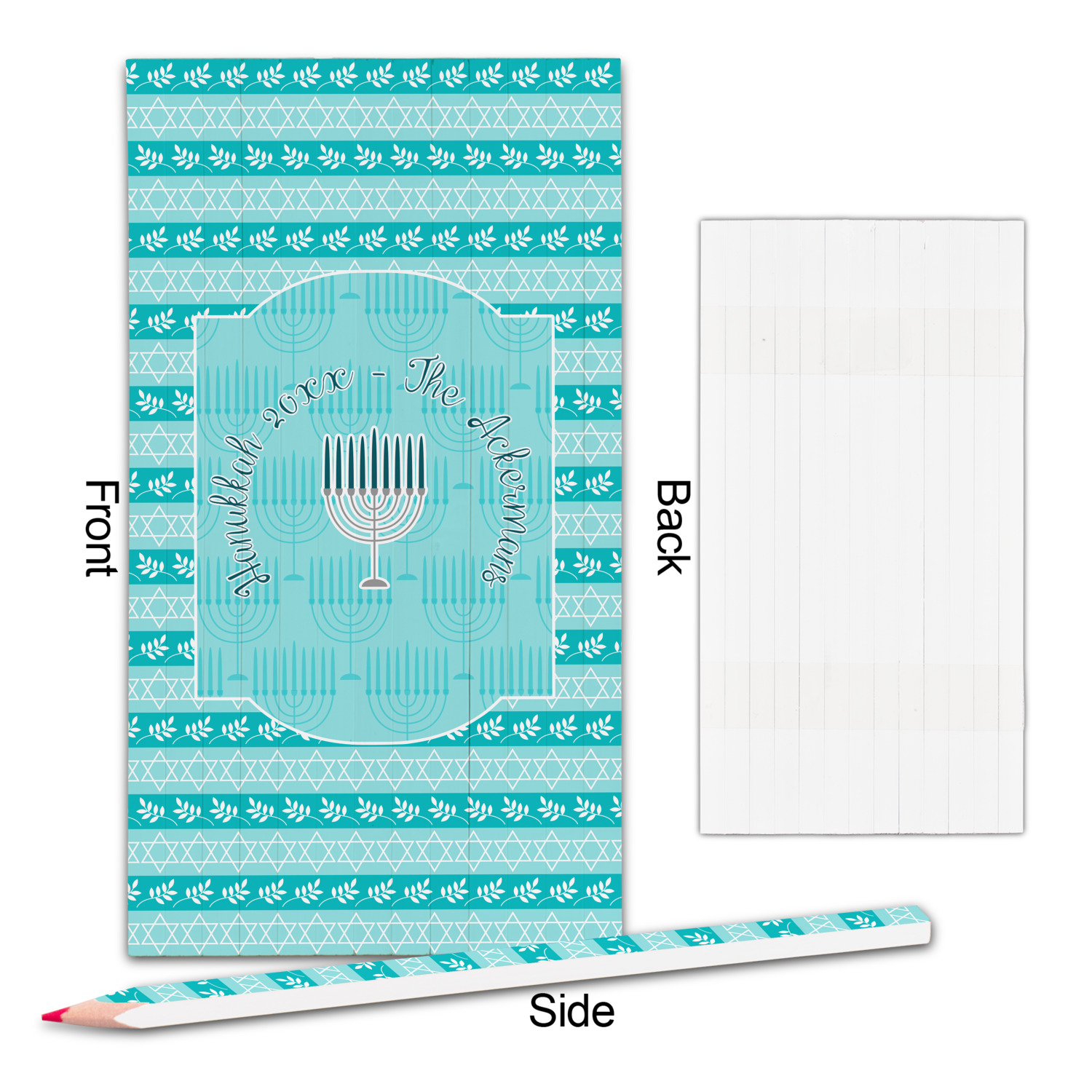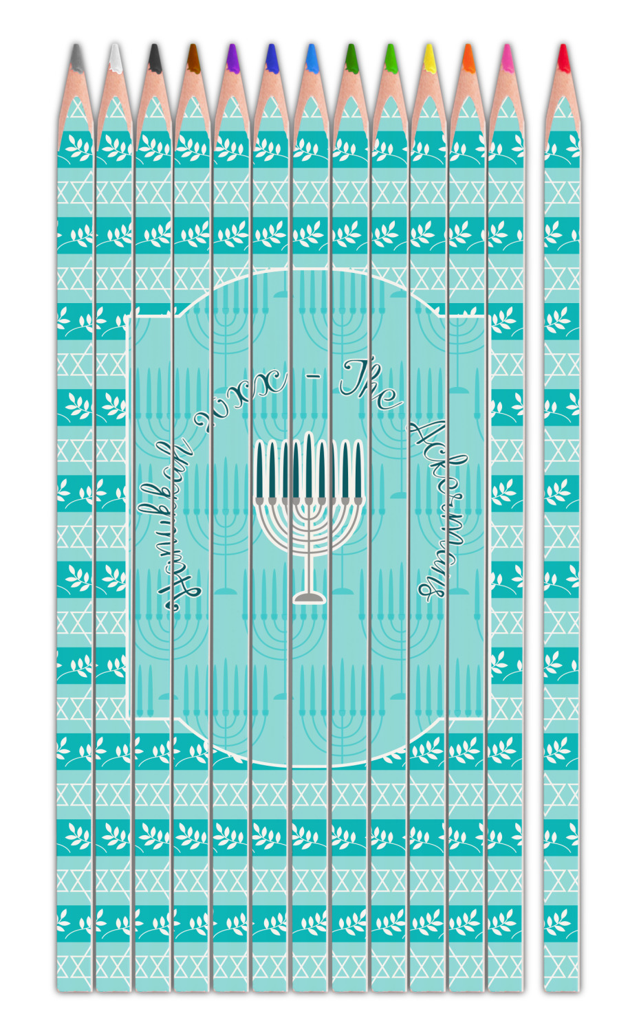 The design is a beautiful set of different shades of teal. You will see three different patterns used throughout this design. One with stripes, olive branches, and stars of David, one with menoras, and the last with doves, menoras, olive branches, and stars of David. The main design has a tall frame with your personalization and a menora graphic in the middle.