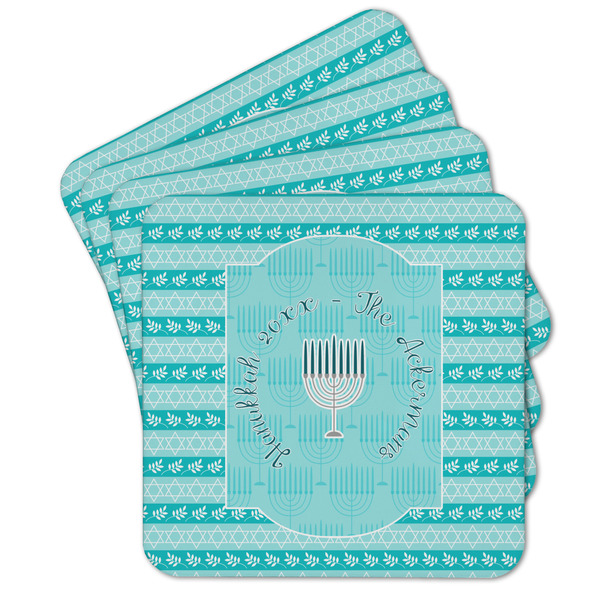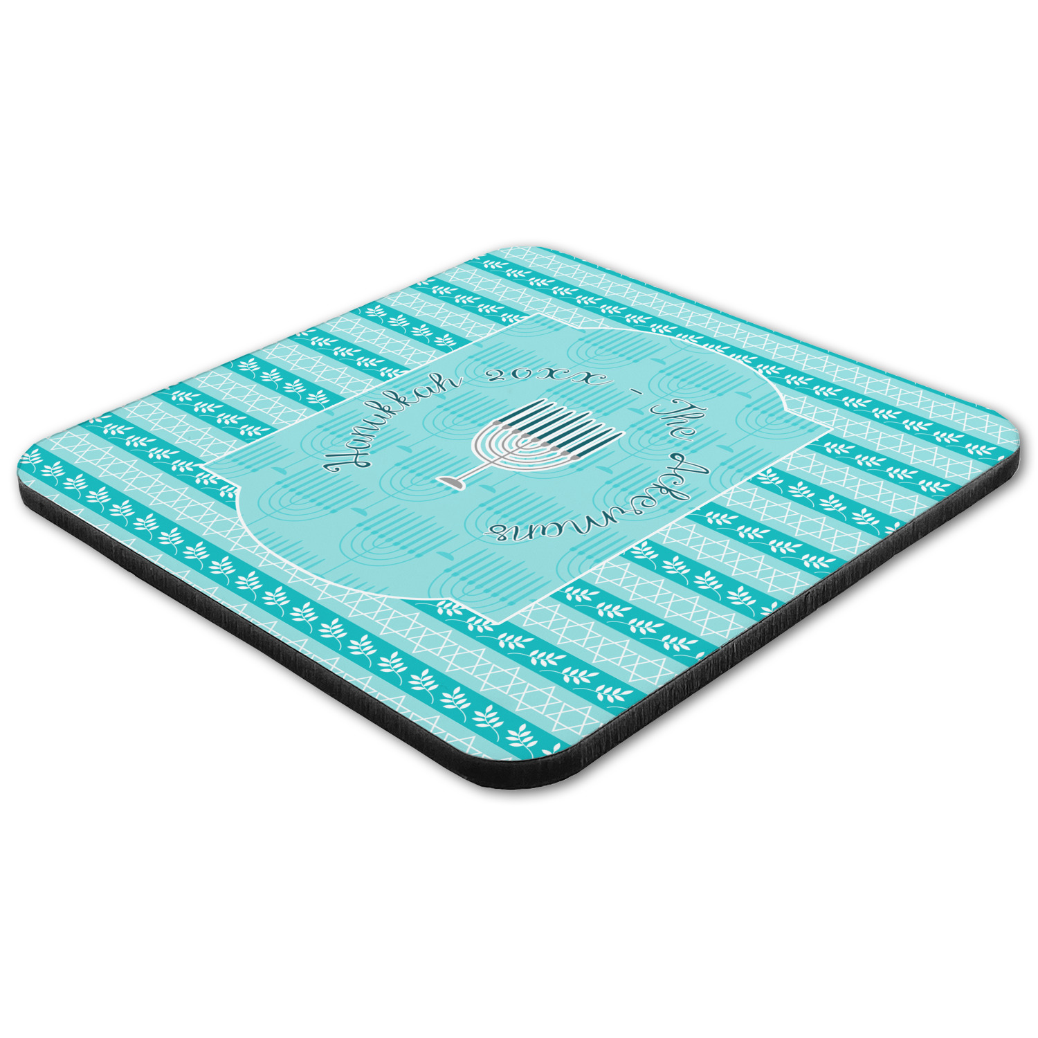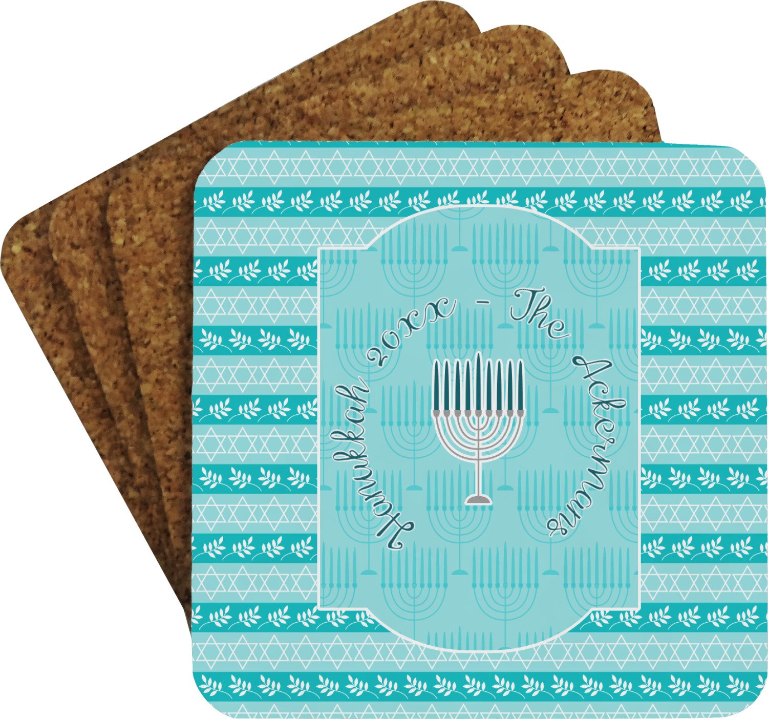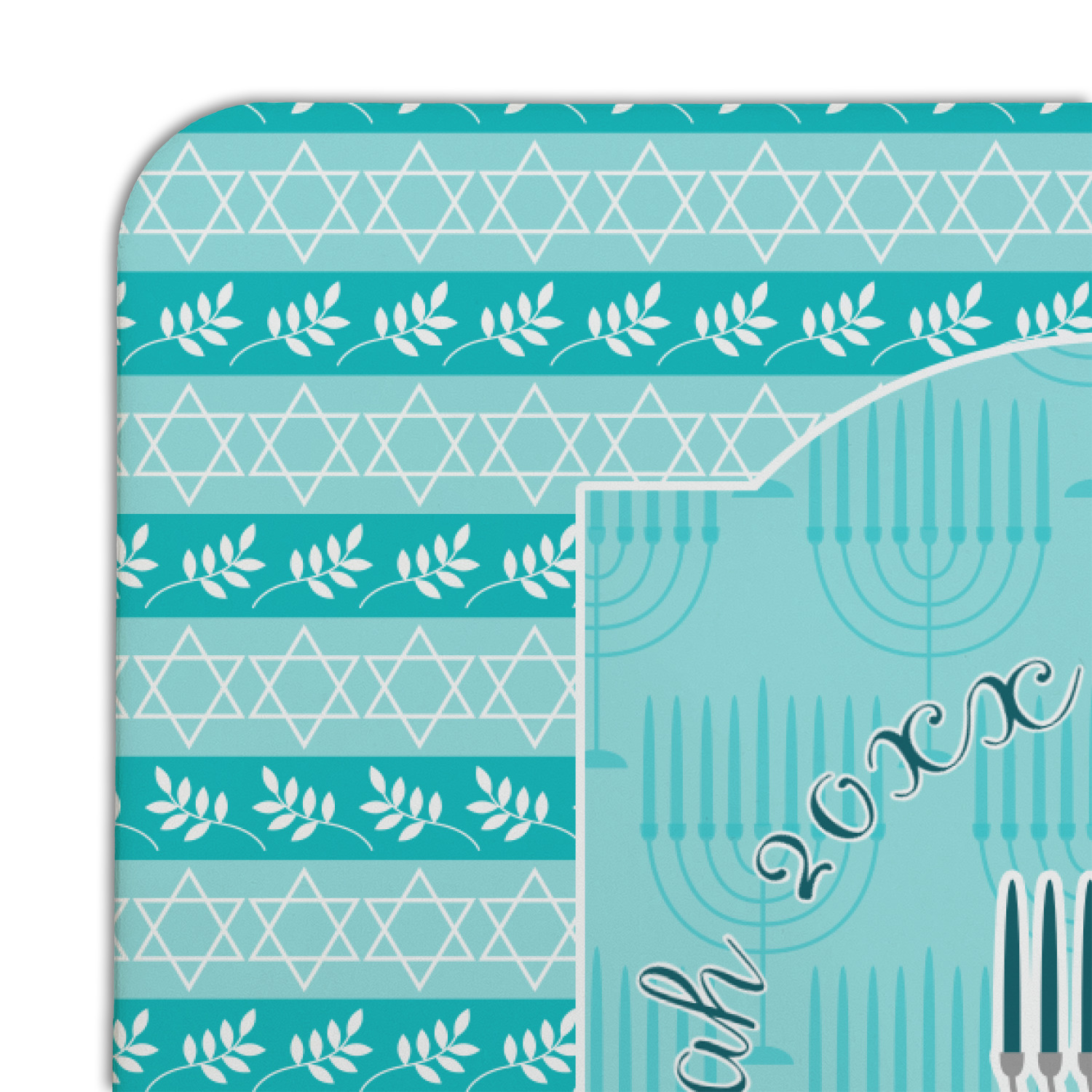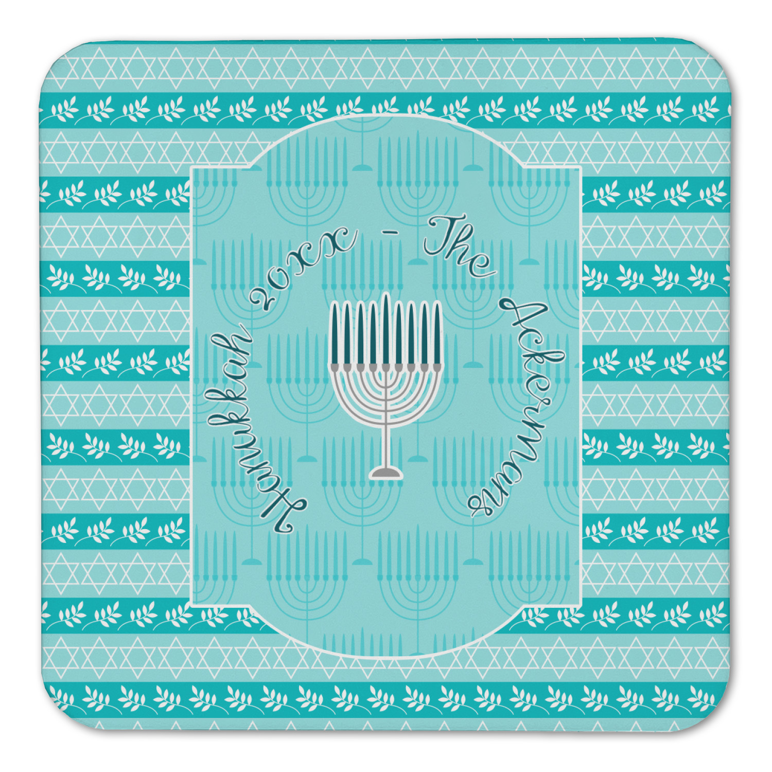 The design is a beautiful set of different shades of teal. You will see three different patterns used throughout this design. One with stripes, olive branches, and stars of David, one with menoras, and the last with doves, menoras, olive branches, and stars of David. The main design has a tall frame with your personalization and a menora graphic in the middle.