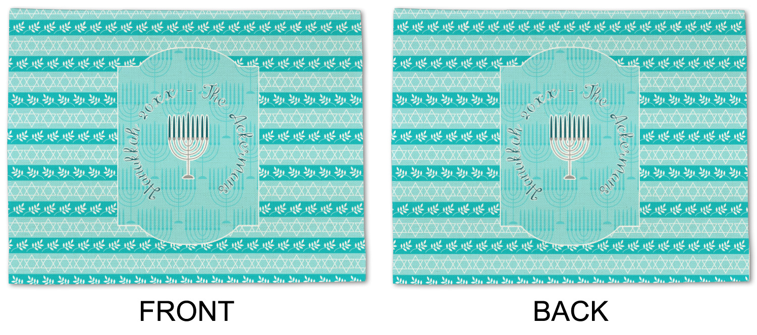 The design is a beautiful set of different shades of teal. You will see three different patterns used throughout this design. One with stripes, olive branches, and stars of David, one with menoras, and the last with doves, menoras, olive branches, and stars of David. The main design has a tall frame with your personalization and a menora graphic in the middle.