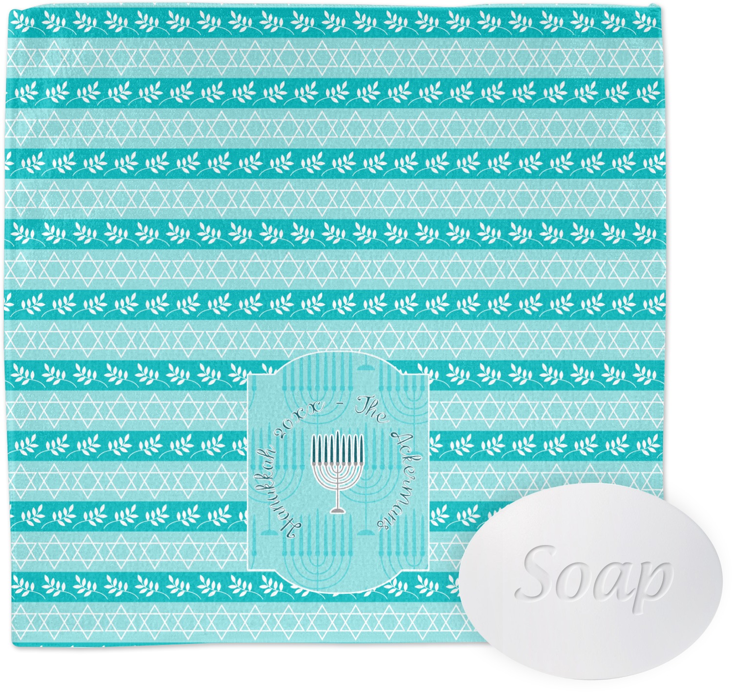 The design is a beautiful set of different shades of teal. You will see three different patterns used throughout this design. One with stripes, olive branches, and stars of David, one with menoras, and the last with doves, menoras, olive branches, and stars of David. The main design has a tall frame with your personalization and a menora graphic in the middle.