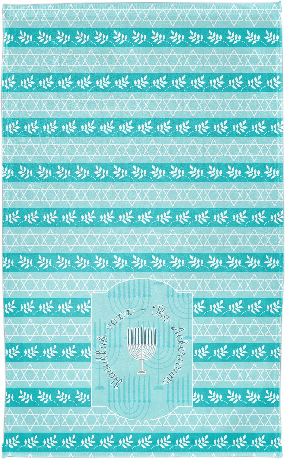 The design is a beautiful set of different shades of teal. You will see three different patterns used throughout this design. One with stripes, olive branches, and stars of David, one with menoras, and the last with doves, menoras, olive branches, and stars of David. The main design has a tall frame with your personalization and a menora graphic in the middle.