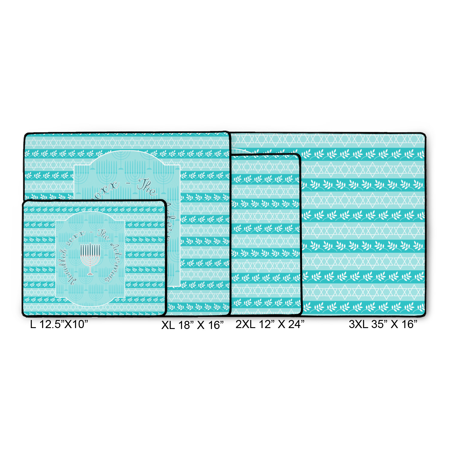 The design is a beautiful set of different shades of teal. You will see three different patterns used throughout this design. One with stripes, olive branches, and stars of David, one with menoras, and the last with doves, menoras, olive branches, and stars of David. The main design has a tall frame with your personalization and a menora graphic in the middle.