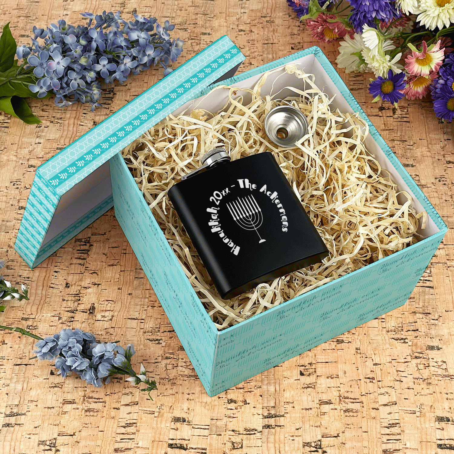 The design is a beautiful set of different shades of teal. You will see three different patterns used throughout this design. One with stripes, olive branches, and stars of David, one with menoras, and the last with doves, menoras, olive branches, and stars of David. The main design has a tall frame with your personalization and a menora graphic in the middle.