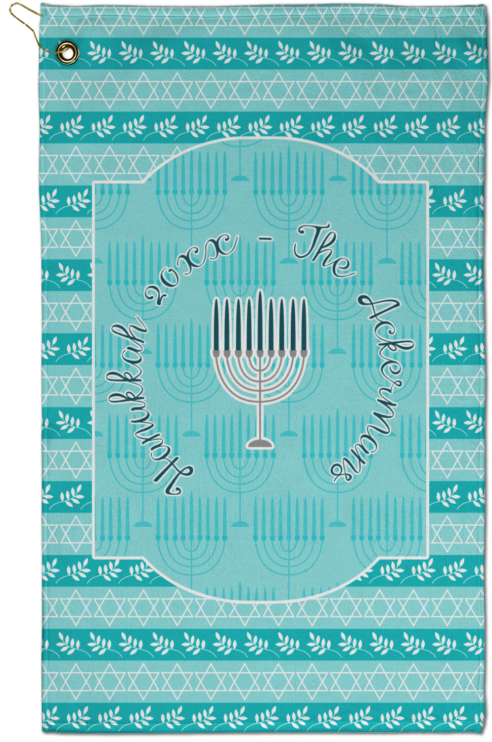 The design is a beautiful set of different shades of teal. You will see three different patterns used throughout this design. One with stripes, olive branches, and stars of David, one with menoras, and the last with doves, menoras, olive branches, and stars of David. The main design has a tall frame with your personalization and a menora graphic in the middle.