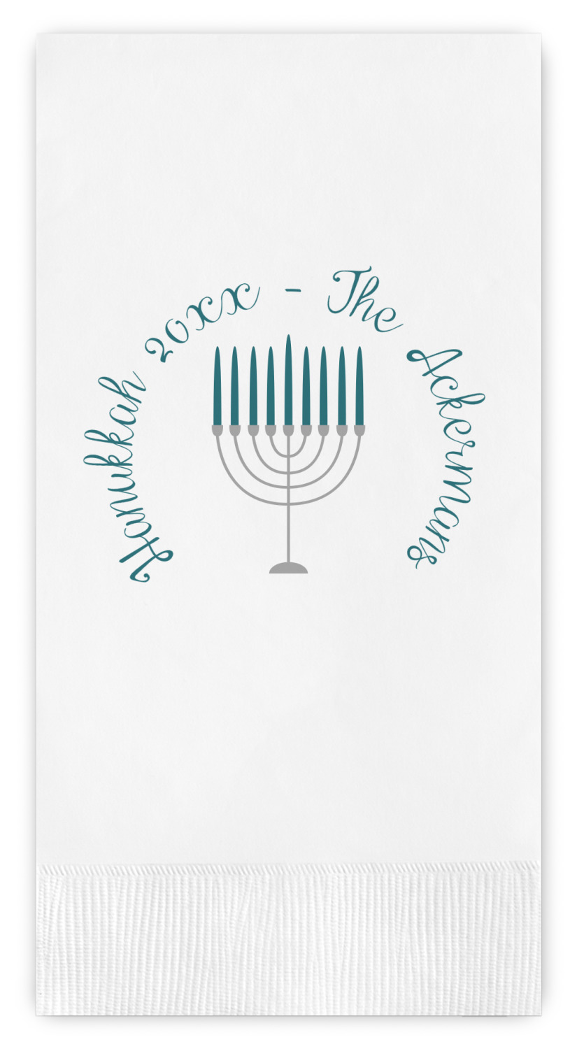 The design is a beautiful set of different shades of teal. You will see three different patterns used throughout this design. One with stripes, olive branches, and stars of David, one with menoras, and the last with doves, menoras, olive branches, and stars of David. The main design has a tall frame with your personalization and a menora graphic in the middle.