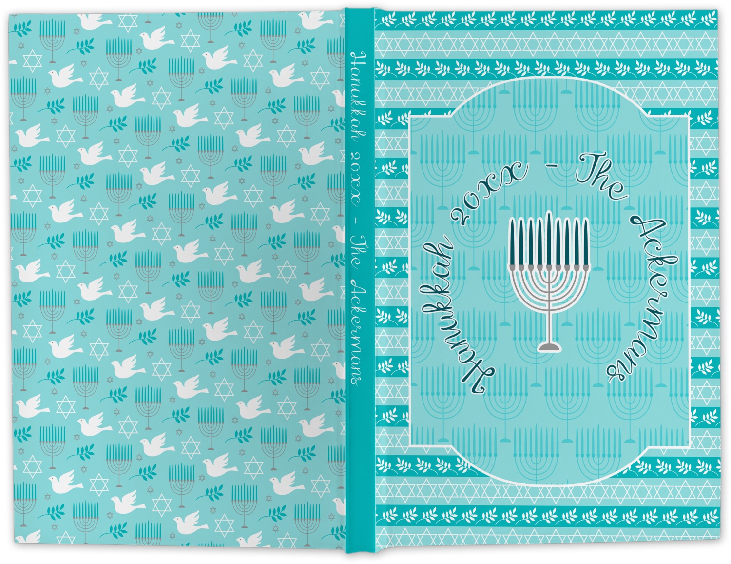 The design is a beautiful set of different shades of teal. You will see three different patterns used throughout this design. One with stripes, olive branches, and stars of David, one with menoras, and the last with doves, menoras, olive branches, and stars of David. The main design has a tall frame with your personalization and a menora graphic in the middle.