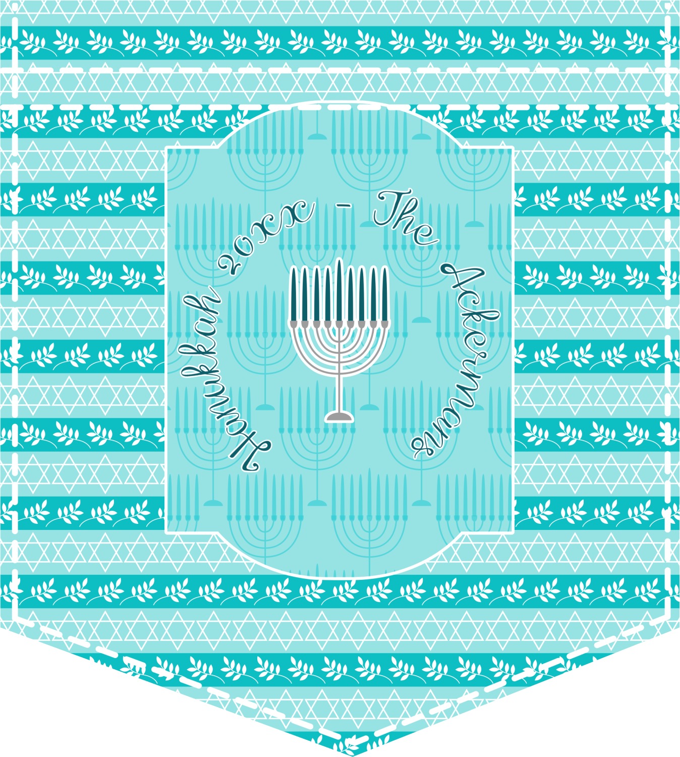 The design is a beautiful set of different shades of teal. You will see three different patterns used throughout this design. One with stripes, olive branches, and stars of David, one with menoras, and the last with doves, menoras, olive branches, and stars of David. The main design has a tall frame with your personalization and a menora graphic in the middle.