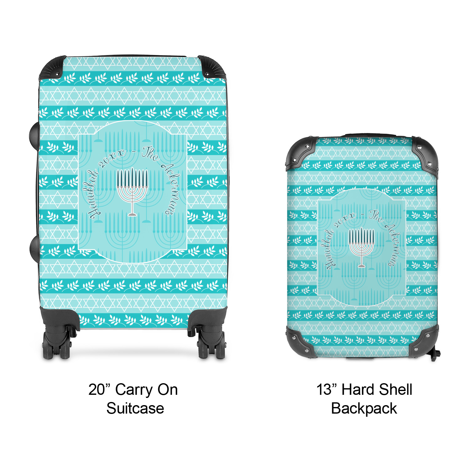 The design is a beautiful set of different shades of teal. You will see three different patterns used throughout this design. One with stripes, olive branches, and stars of David, one with menoras, and the last with doves, menoras, olive branches, and stars of David. The main design has a tall frame with your personalization and a menora graphic in the middle.