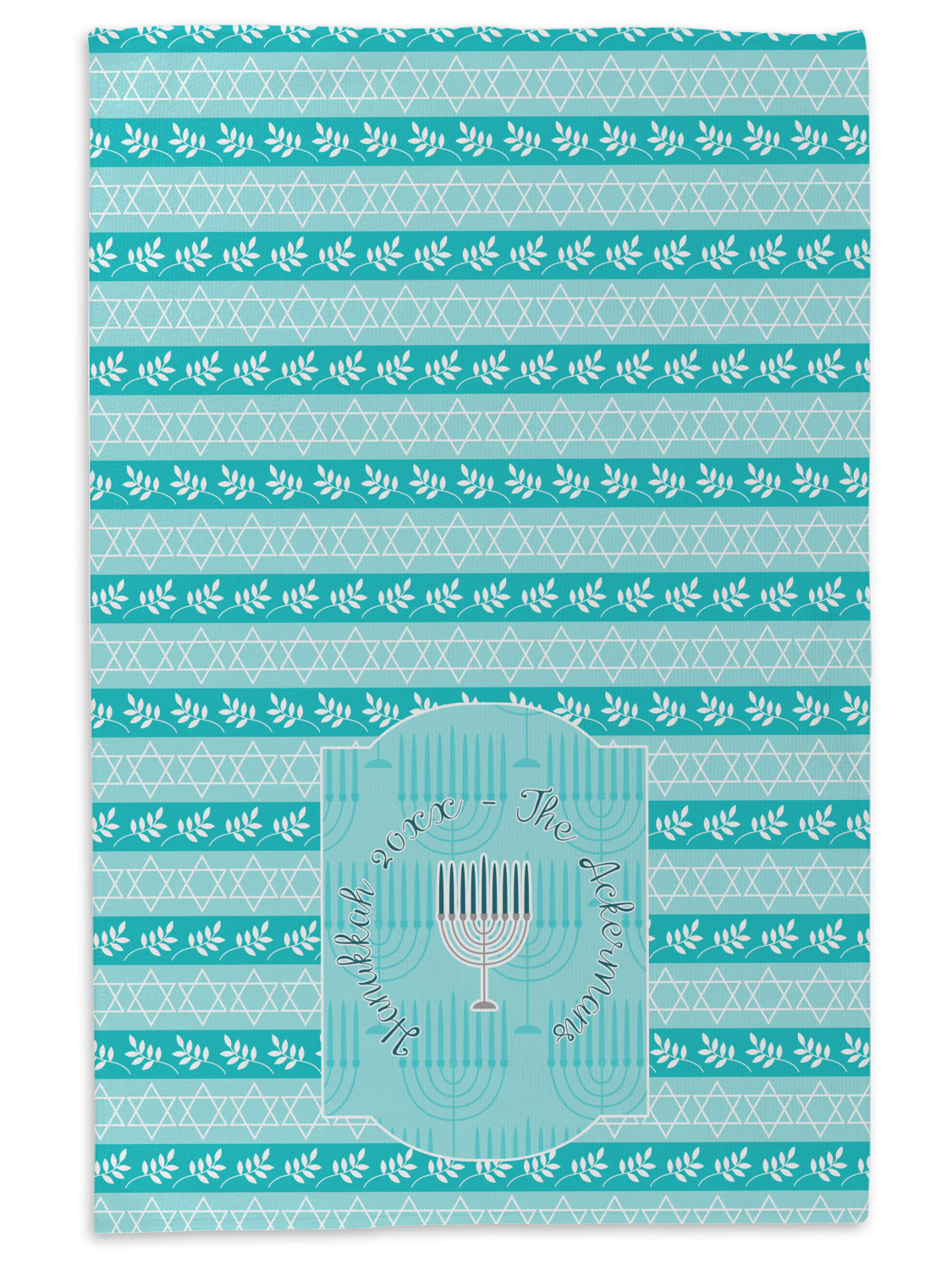 The design is a beautiful set of different shades of teal. You will see three different patterns used throughout this design. One with stripes, olive branches, and stars of David, one with menoras, and the last with doves, menoras, olive branches, and stars of David. The main design has a tall frame with your personalization and a menora graphic in the middle.