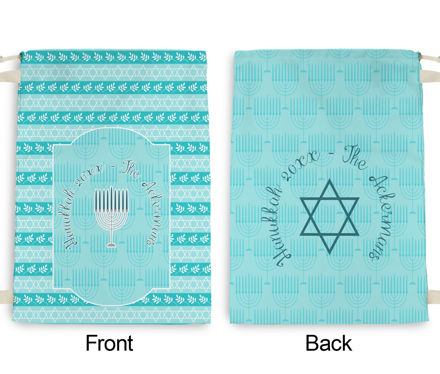 The design is a beautiful set of different shades of teal. You will see three different patterns used throughout this design. One with stripes, olive branches, and stars of David, one with menoras, and the last with doves, menoras, olive branches, and stars of David. The main design has a tall frame with your personalization and a menora graphic in the middle.