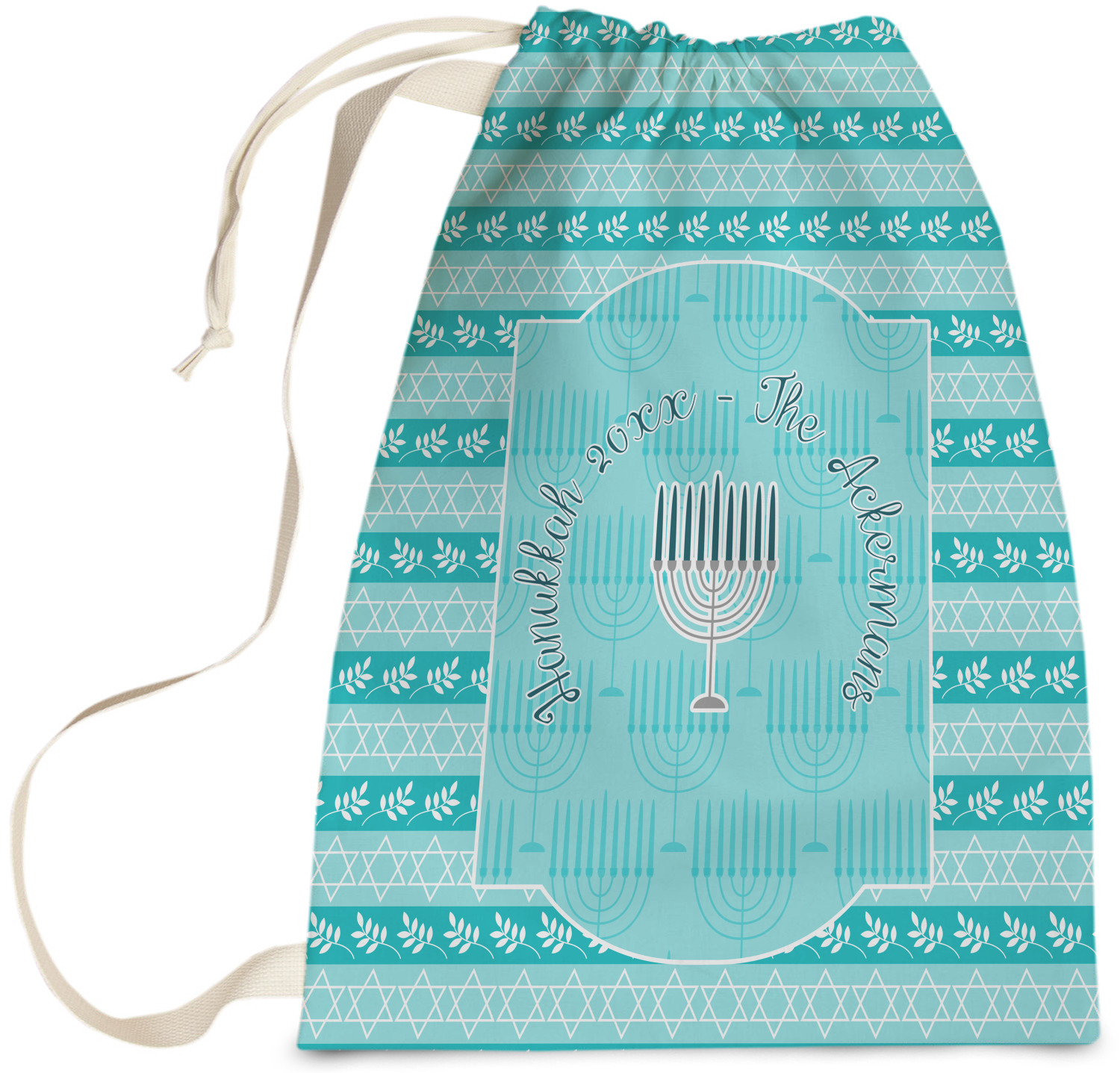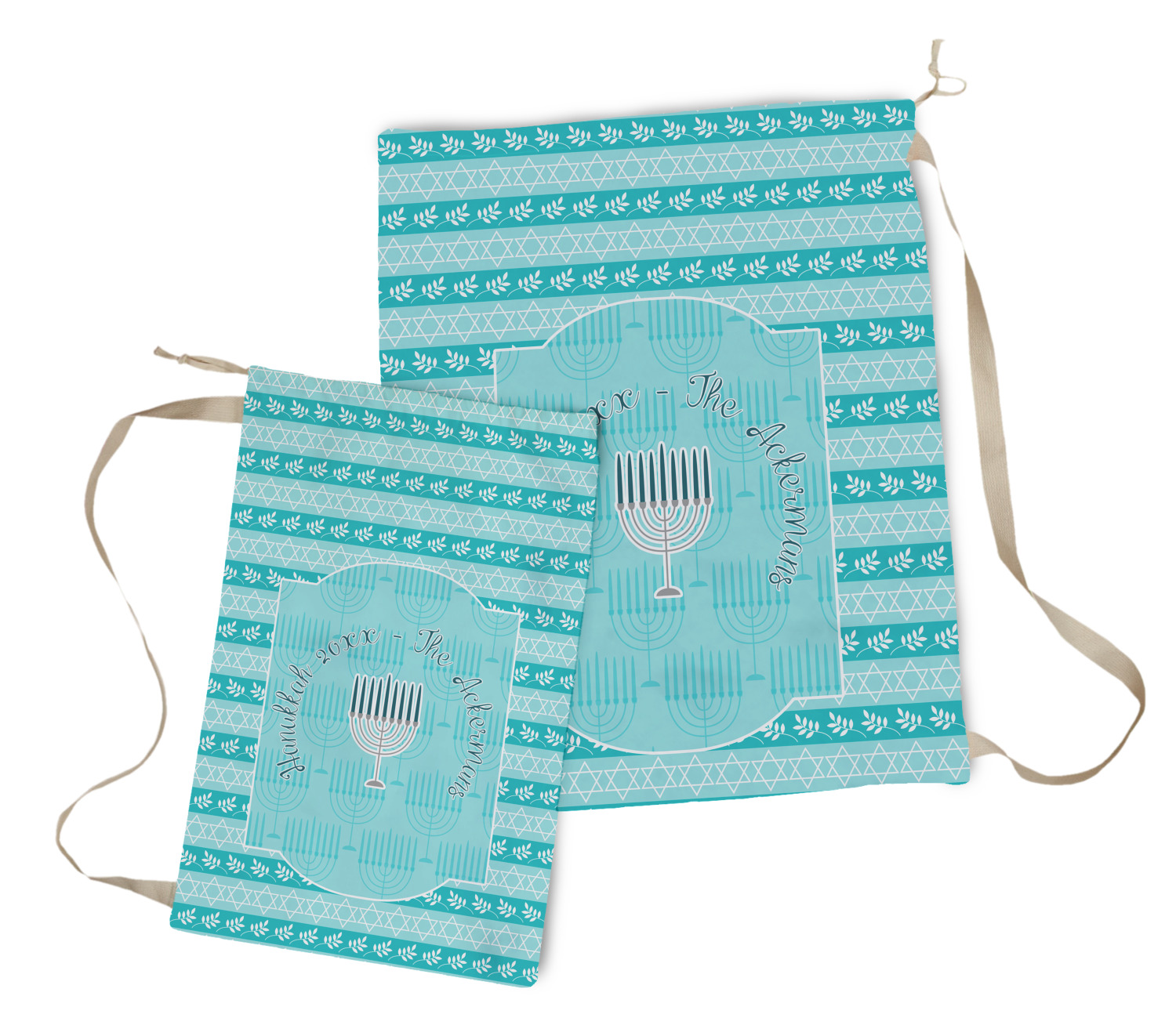 The design is a beautiful set of different shades of teal. You will see three different patterns used throughout this design. One with stripes, olive branches, and stars of David, one with menoras, and the last with doves, menoras, olive branches, and stars of David. The main design has a tall frame with your personalization and a menora graphic in the middle.