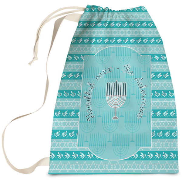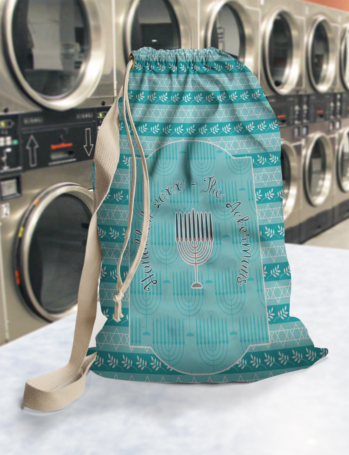 Carry your laundry in style with these customized laundry bags. Available in two sizes, featuring a natural colored woven strap and a cinch cord, these bags hold a lot of clothes or anything else you want to fit in them.
