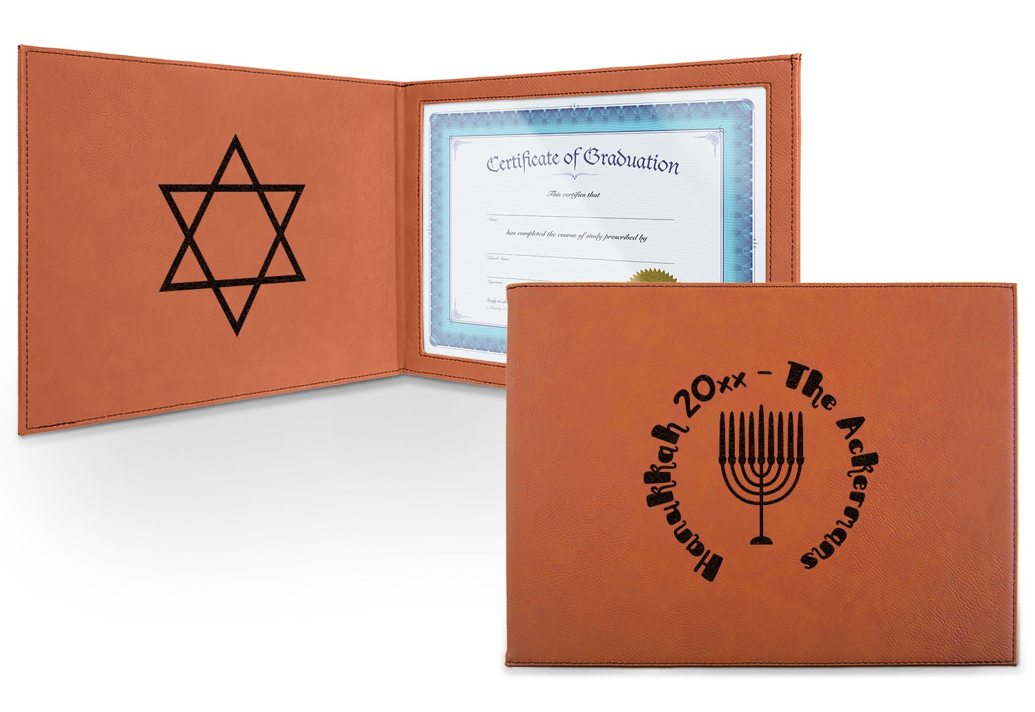 This cognac-colored, leatherette certificate jacket is the ideal way to display or store your hard-earned certificate. When closed, the custom certificate holder measures at 12 by 9 inches. The interior of the certificate cover includes a clear, vinyl window to encase your diploma. The window measures at around 10.5 by 7.5 inches and can accommodate a diploma that measures at up to 8.5 by 11 inches. You can either choose to have your customization laser engraved on the front and interior, or solely the front.