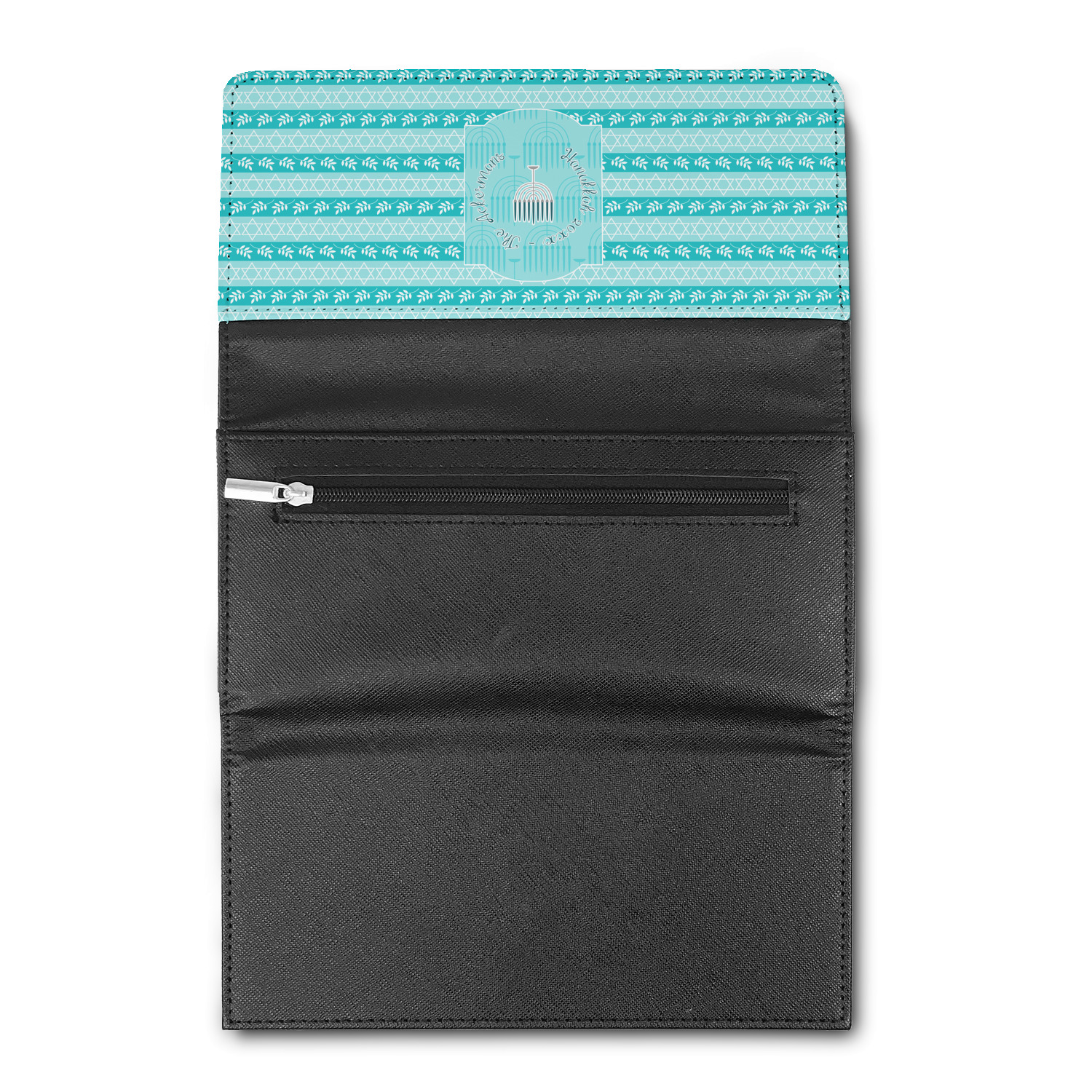 The design is a beautiful set of different shades of teal. You will see three different patterns used throughout this design. One with stripes, olive branches, and stars of David, one with menoras, and the last with doves, menoras, olive branches, and stars of David. The main design has a tall frame with your personalization and a menora graphic in the middle.