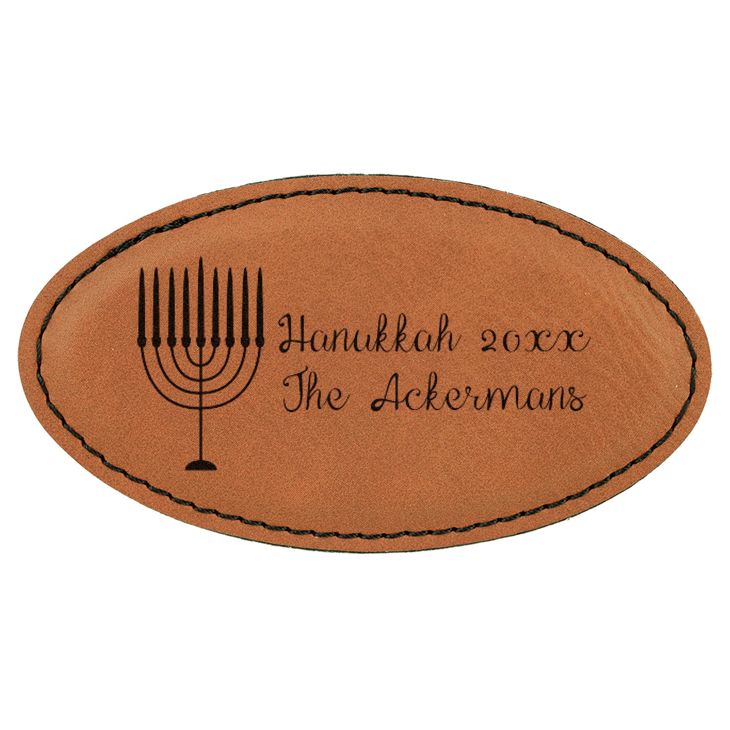 Made from a cognac-brown leatherette into an oval shape, these custom name badges measure at around 3.25" x 1.75". To add the suave appearance of this custom badge, a fine black stitching lines the edges or the badge itself. Your customized design is laser-engraved onto the surface of the leatherette. Accompanying your purchase is a removable magnet strip that can be used to secure the engraved name tag to any shirt, dress, or jacket.