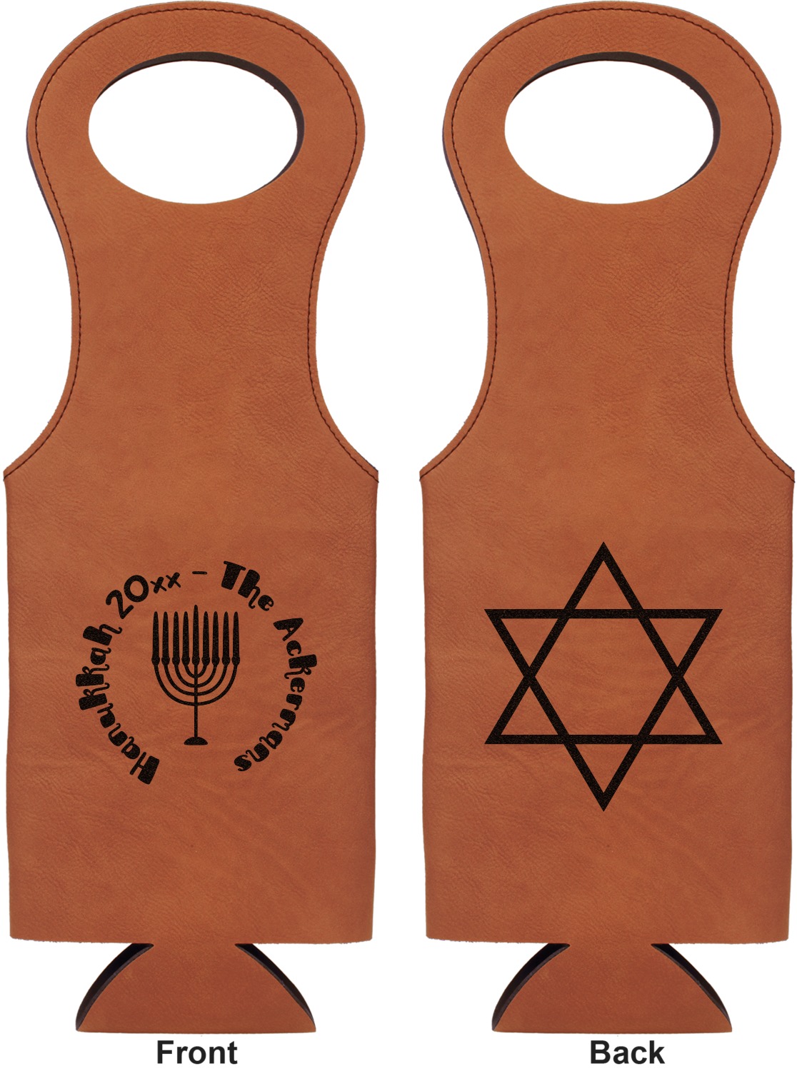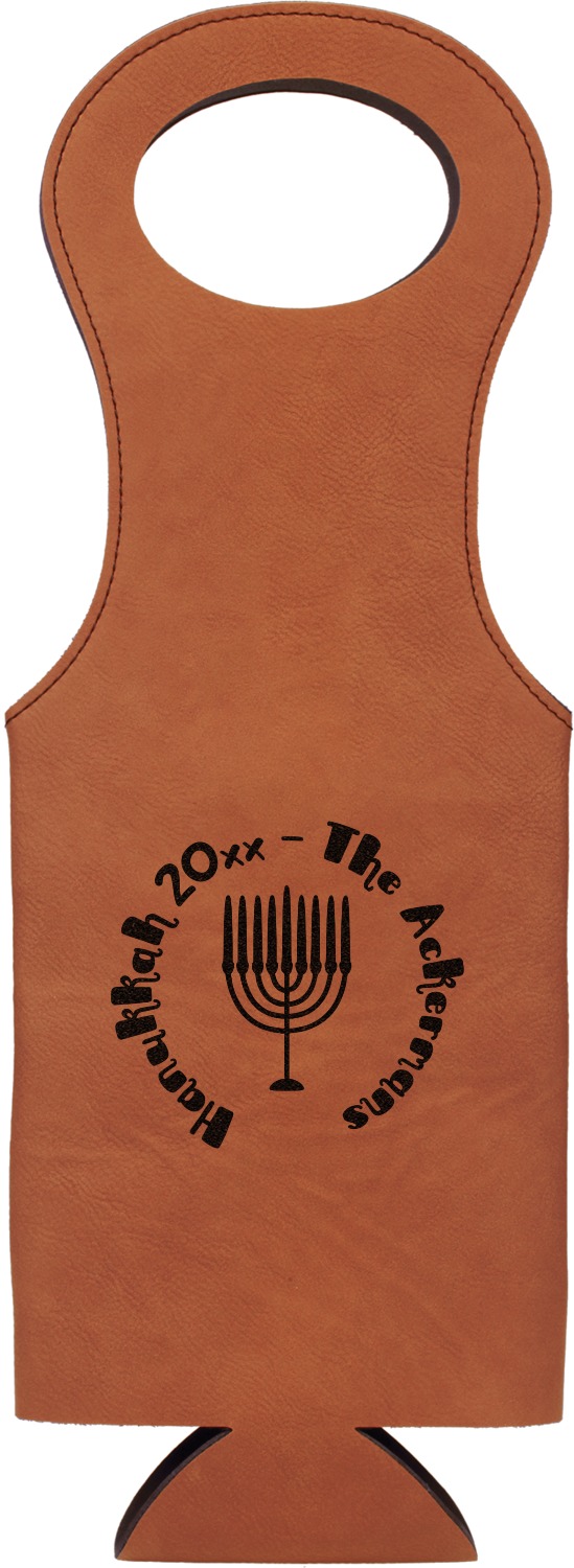 This wine carrier is made from a stunning leatherette, in a cognac-brown color. Strong, black stitching lines the sides of your wine bottle bag and provides extra durability. The interior is lined with a padded, black material to allow for a snug fit once your bottle is placed inside. At the top of this wine gift bag, you'll find two oval shaped handles that elegantly complements the rest of the bag's style. We provide you with the option of laser-engraving the front, or the front and back of your new personalized wine bag!