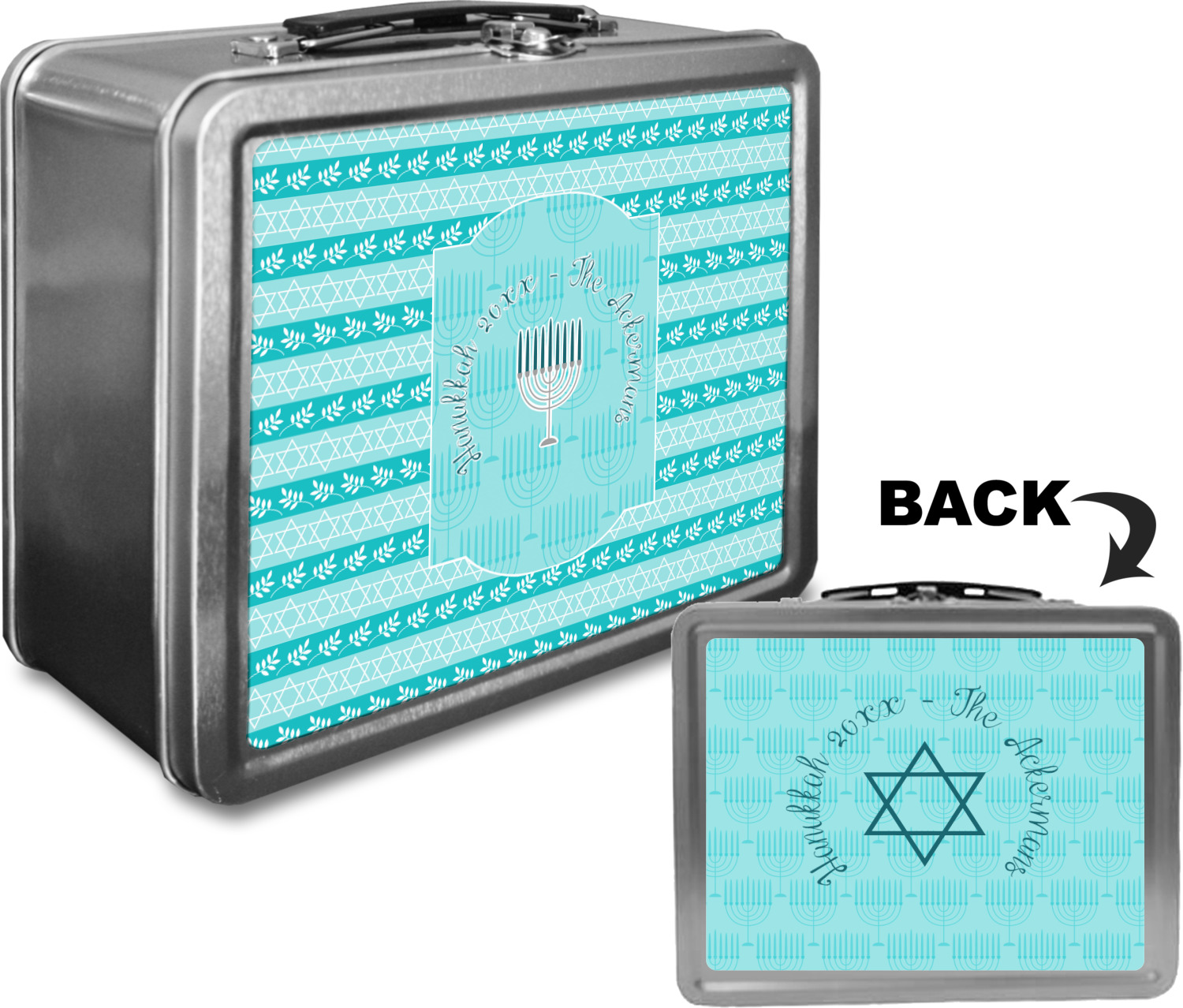 The design is a beautiful set of different shades of teal. You will see three different patterns used throughout this design. One with stripes, olive branches, and stars of David, one with menoras, and the last with doves, menoras, olive branches, and stars of David. The main design has a tall frame with your personalization and a menora graphic in the middle.