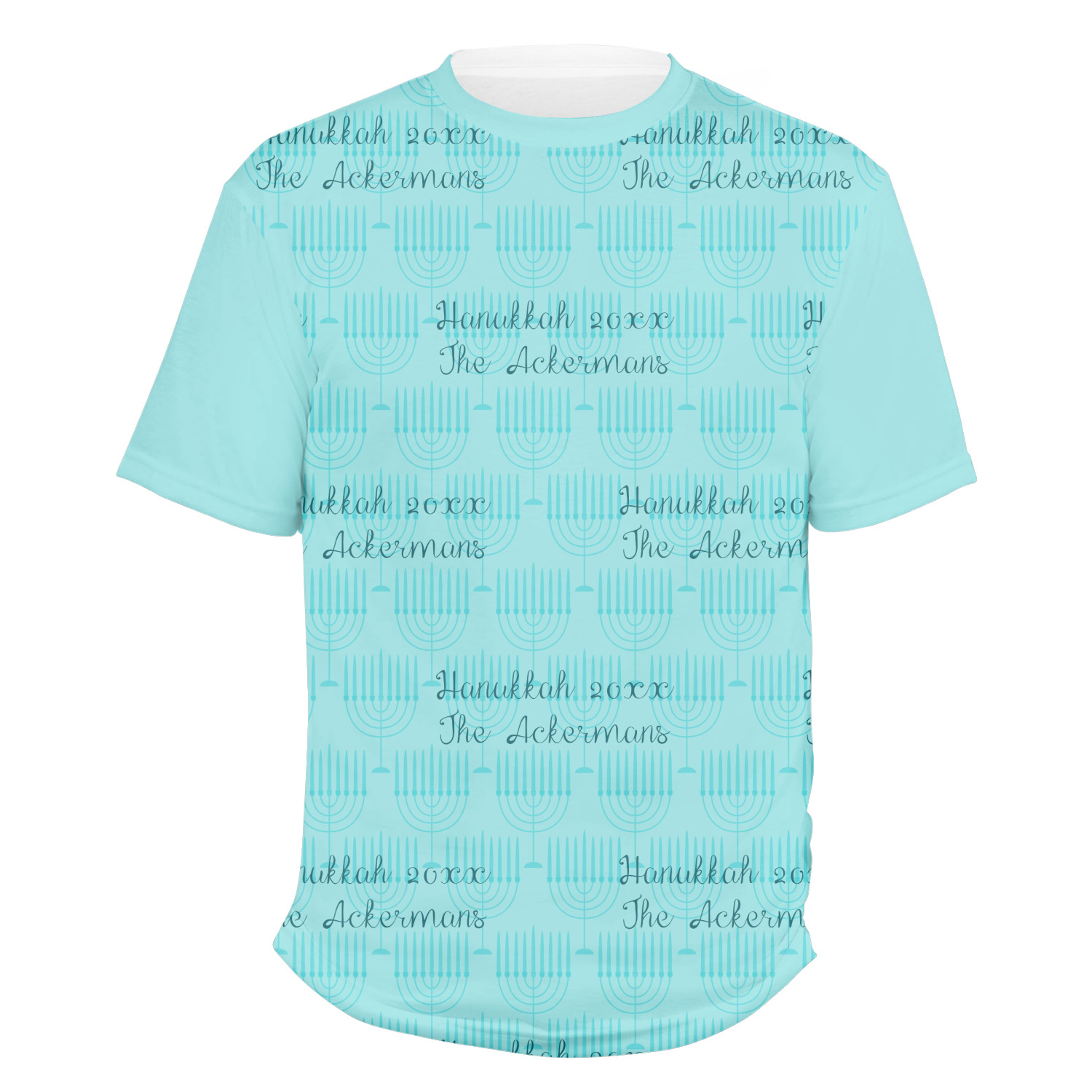 The design is a beautiful set of different shades of teal. You will see three different patterns used throughout this design. One with stripes, olive branches, and stars of David, one with menoras, and the last with doves, menoras, olive branches, and stars of David. The main design has a tall frame with your personalization and a menora graphic in the middle.