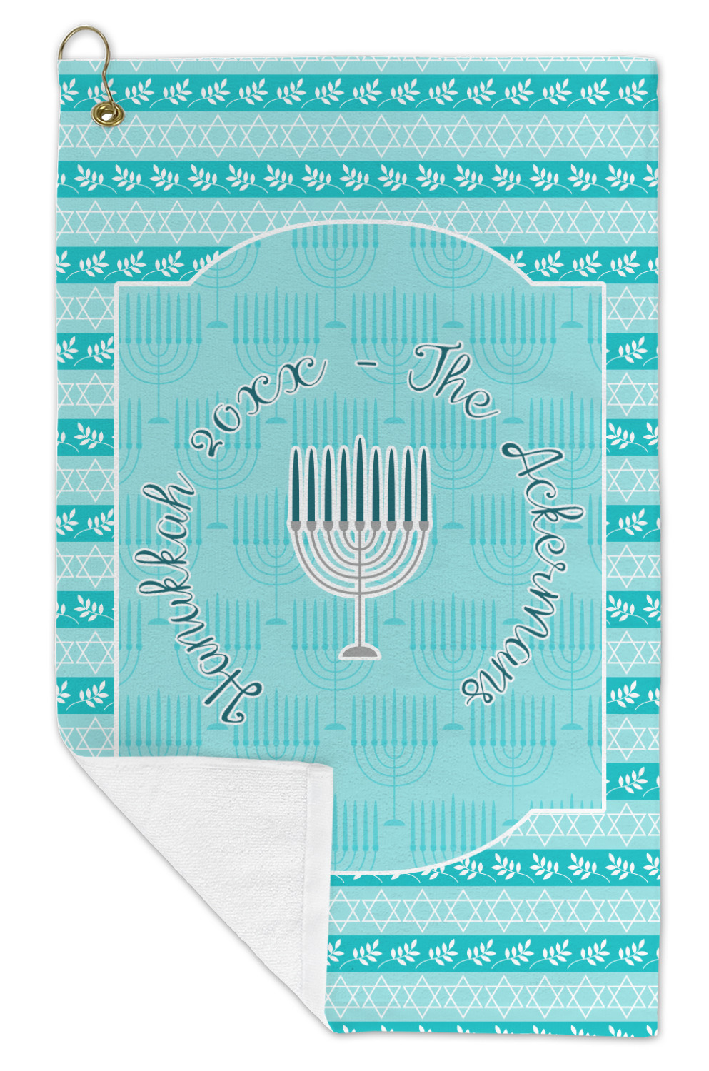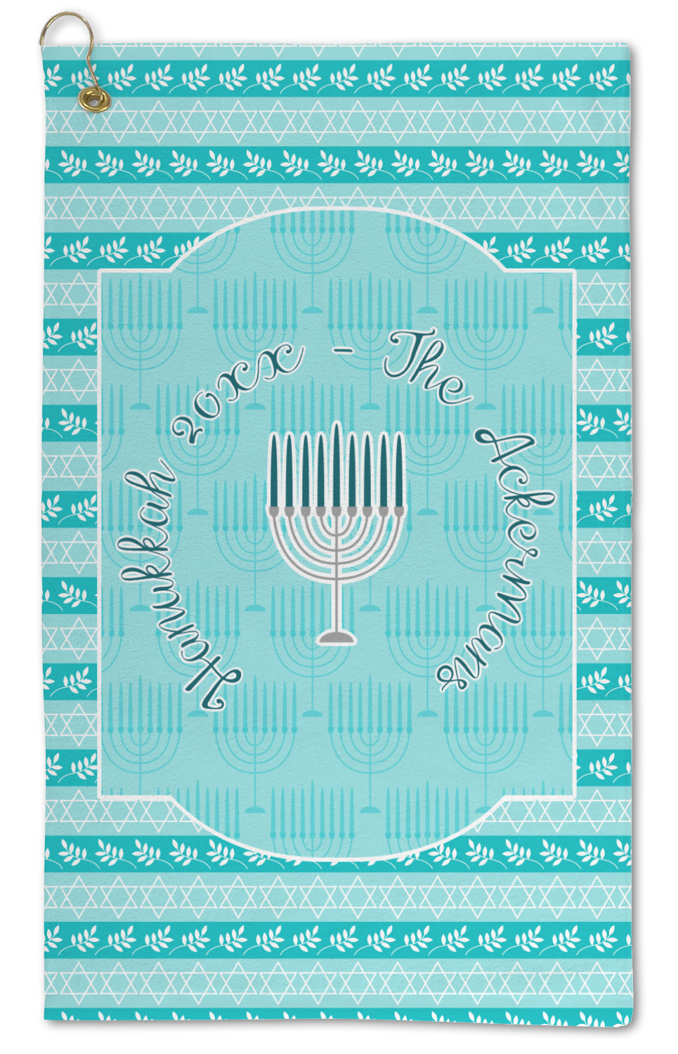 The design is a beautiful set of different shades of teal. You will see three different patterns used throughout this design. One with stripes, olive branches, and stars of David, one with menoras, and the last with doves, menoras, olive branches, and stars of David. The main design has a tall frame with your personalization and a menora graphic in the middle.
