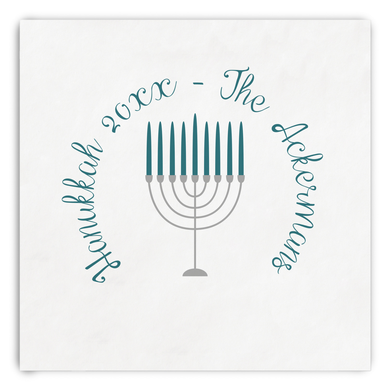 The design is a beautiful set of different shades of teal. You will see three different patterns used throughout this design. One with stripes, olive branches, and stars of David, one with menoras, and the last with doves, menoras, olive branches, and stars of David. The main design has a tall frame with your personalization and a menora graphic in the middle.