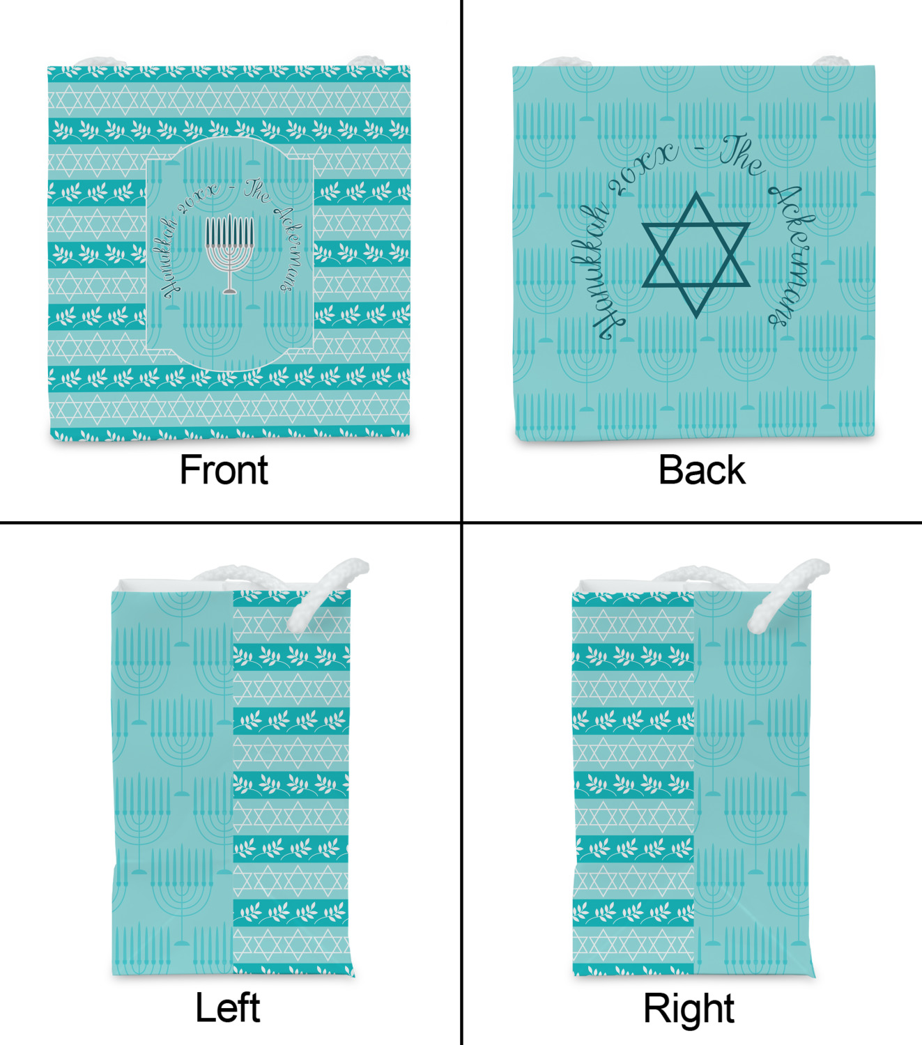 The design is a beautiful set of different shades of teal. You will see three different patterns used throughout this design. One with stripes, olive branches, and stars of David, one with menoras, and the last with doves, menoras, olive branches, and stars of David. The main design has a tall frame with your personalization and a menora graphic in the middle.