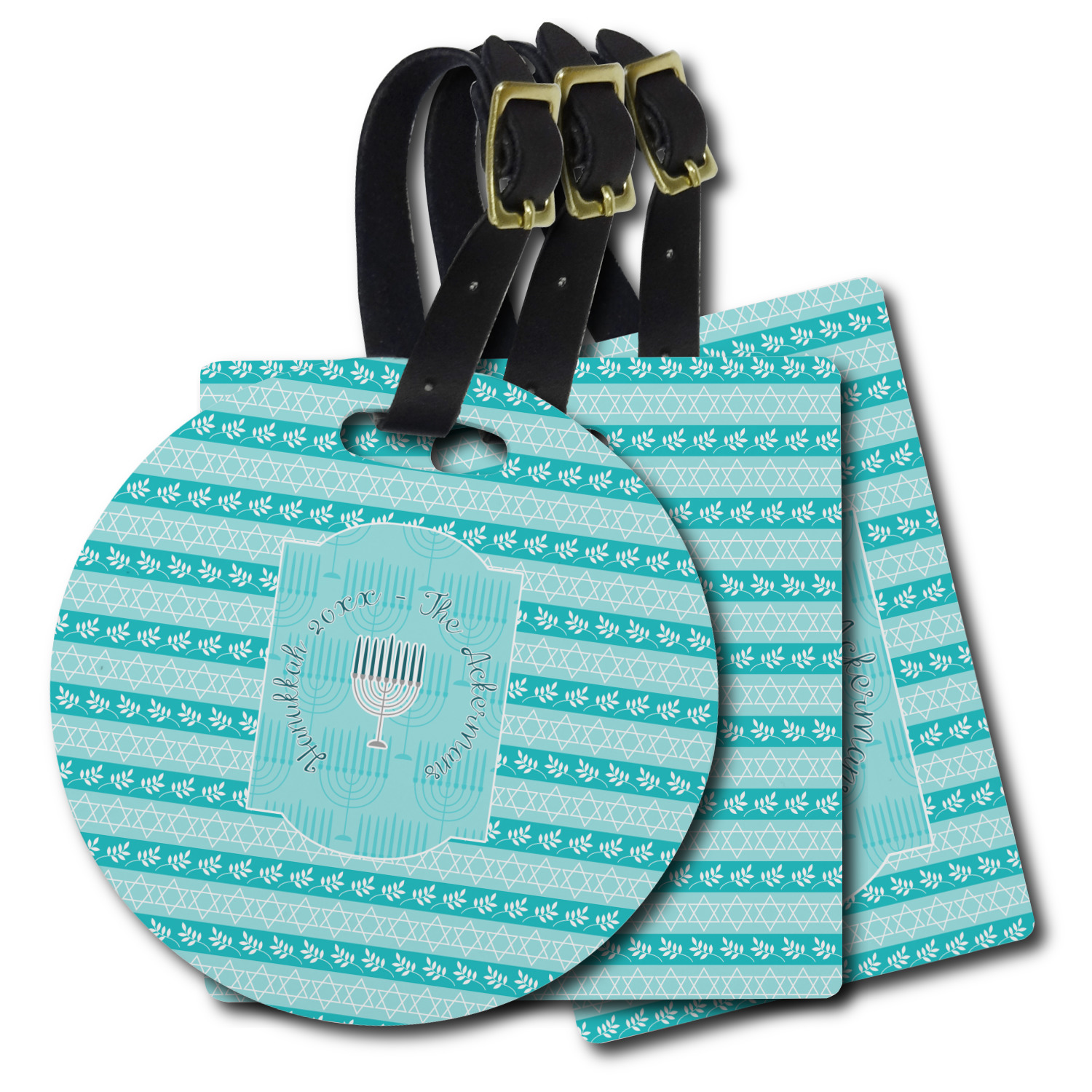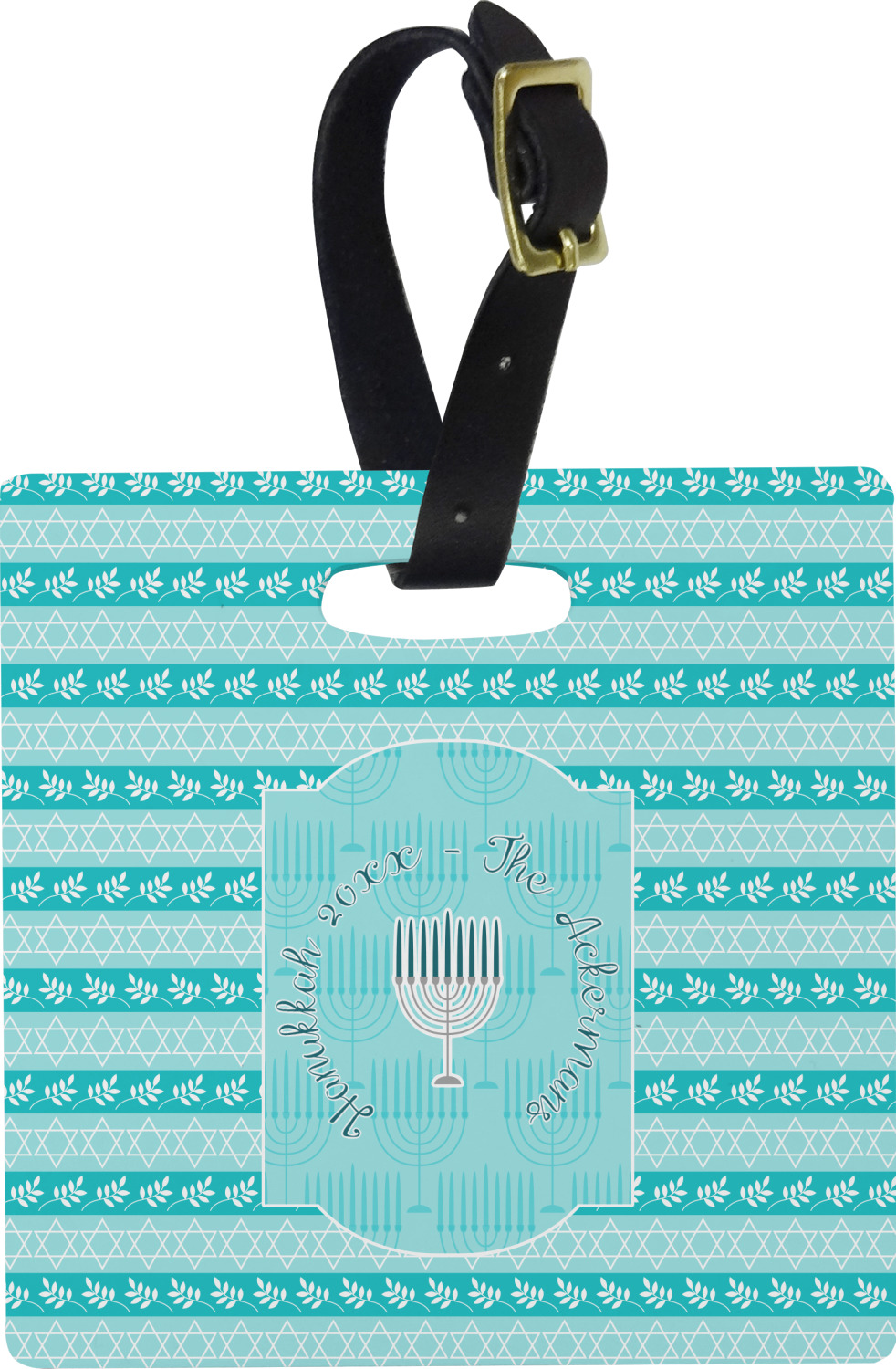 The design is a beautiful set of different shades of teal. You will see three different patterns used throughout this design. One with stripes, olive branches, and stars of David, one with menoras, and the last with doves, menoras, olive branches, and stars of David. The main design has a tall frame with your personalization and a menora graphic in the middle.