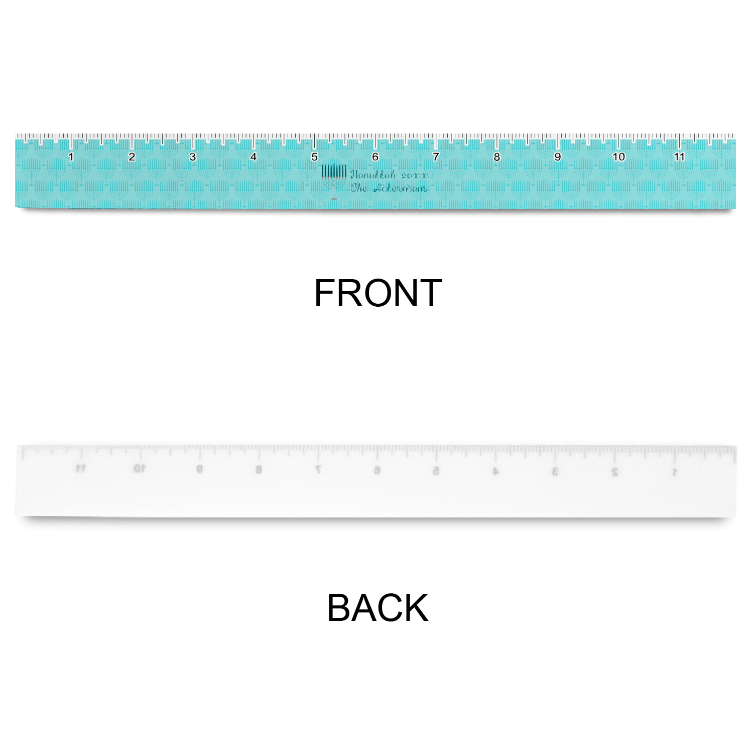 The design is a beautiful set of different shades of teal. You will see three different patterns used throughout this design. One with stripes, olive branches, and stars of David, one with menoras, and the last with doves, menoras, olive branches, and stars of David. The main design has a tall frame with your personalization and a menora graphic in the middle.
