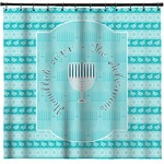 The design is a beautiful set of different shades of teal. You will see three different patterns used throughout this design. One with stripes, olive branches, and stars of David, one with menoras, and the last with doves, menoras, olive branches, and stars of David. The main design has a tall frame with your personalization and a menora graphic in the middle.