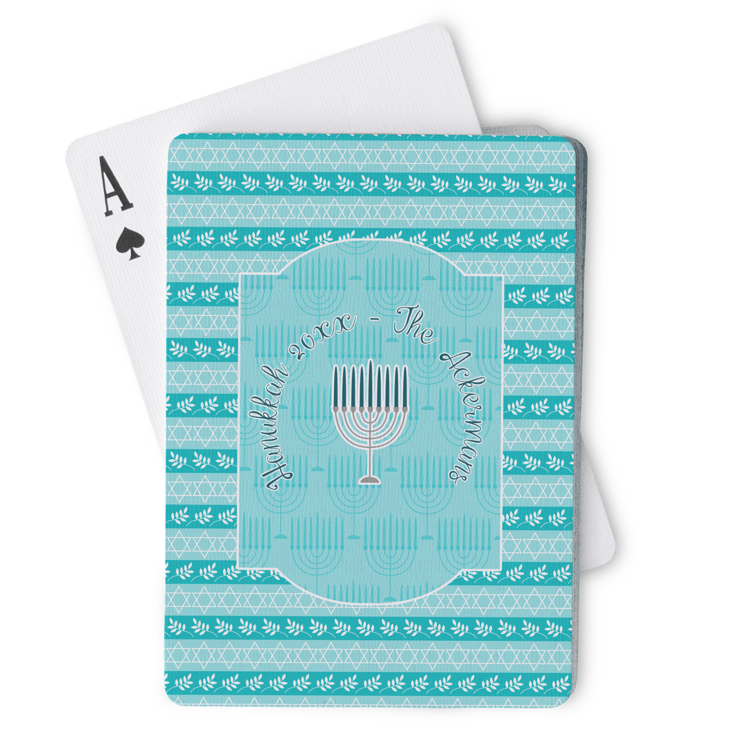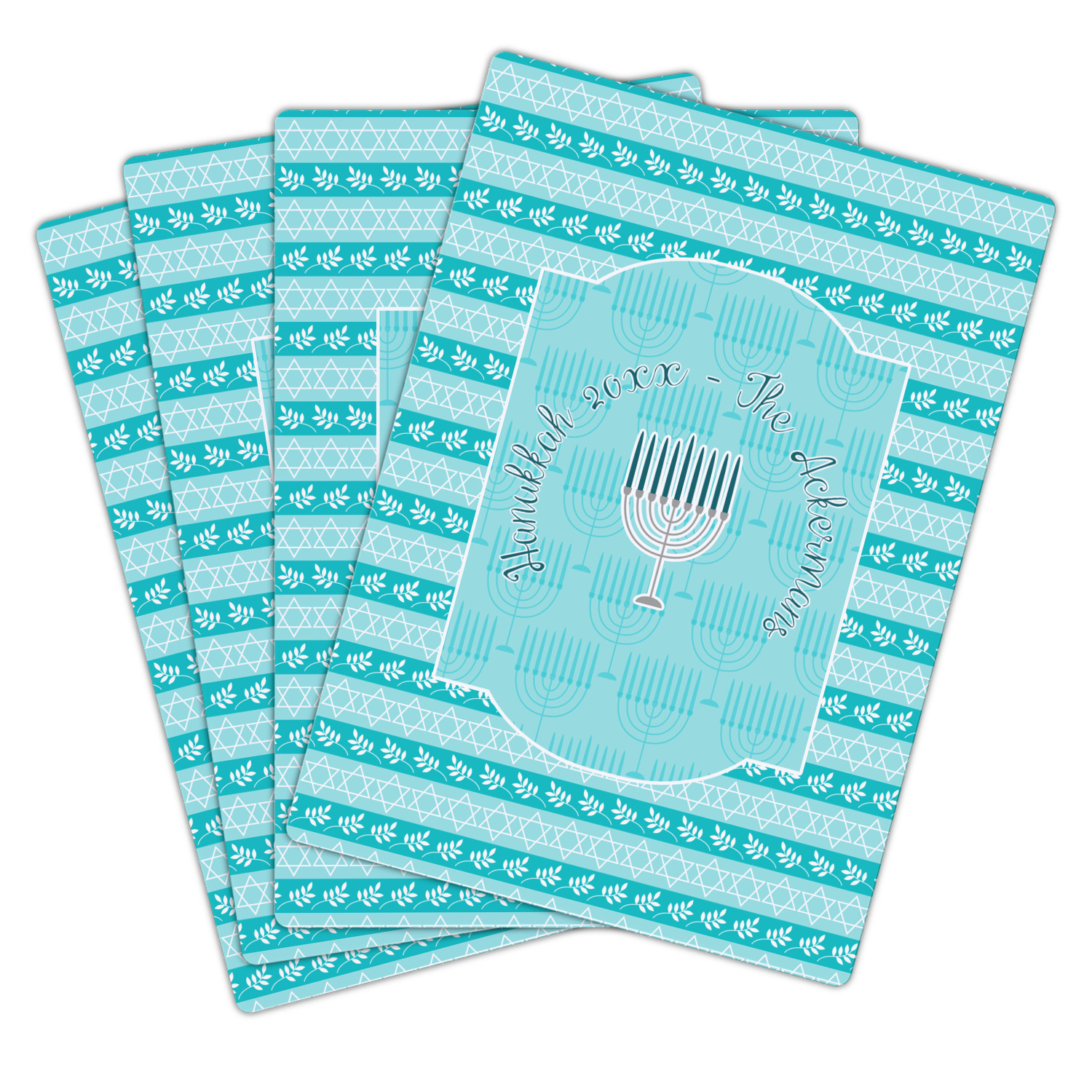 The design is a beautiful set of different shades of teal. You will see three different patterns used throughout this design. One with stripes, olive branches, and stars of David, one with menoras, and the last with doves, menoras, olive branches, and stars of David. The main design has a tall frame with your personalization and a menora graphic in the middle.