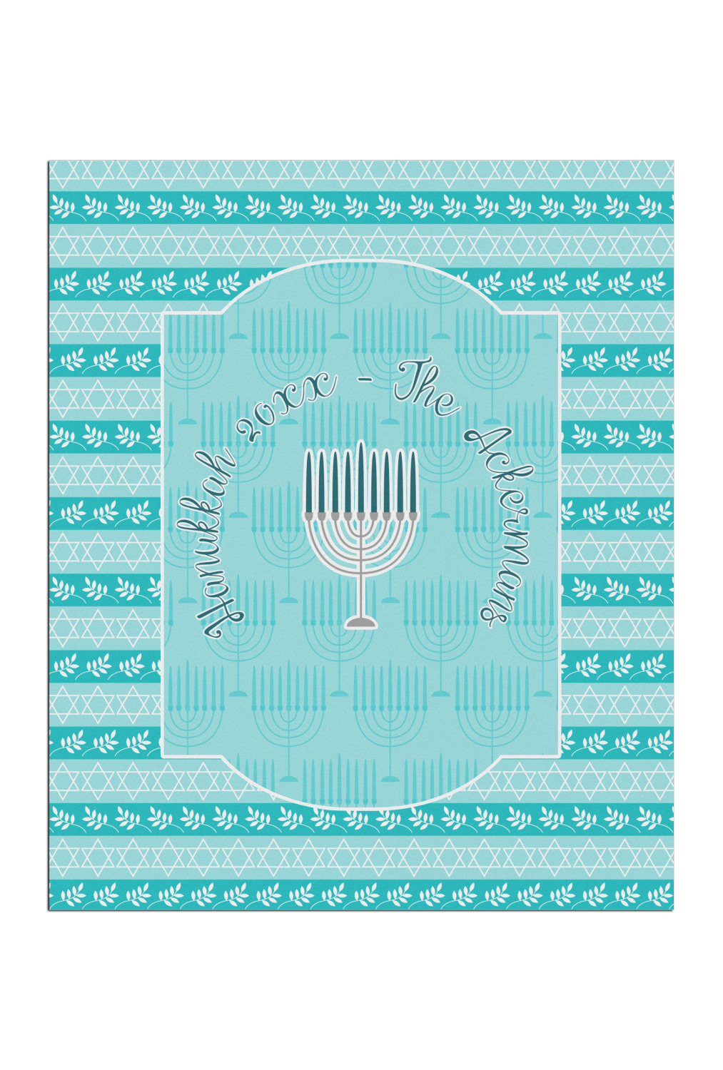 The design is a beautiful set of different shades of teal. You will see three different patterns used throughout this design. One with stripes, olive branches, and stars of David, one with menoras, and the last with doves, menoras, olive branches, and stars of David. The main design has a tall frame with your personalization and a menora graphic in the middle.