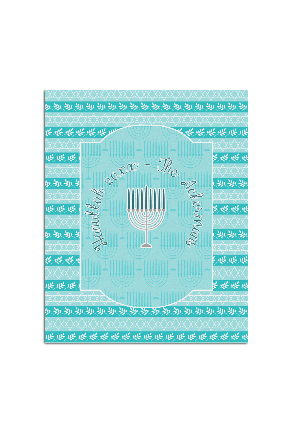 The design is a beautiful set of different shades of teal. You will see three different patterns used throughout this design. One with stripes, olive branches, and stars of David, one with menoras, and the last with doves, menoras, olive branches, and stars of David. The main design has a tall frame with your personalization and a menora graphic in the middle.
