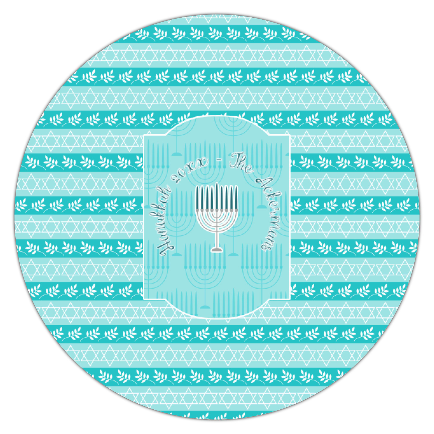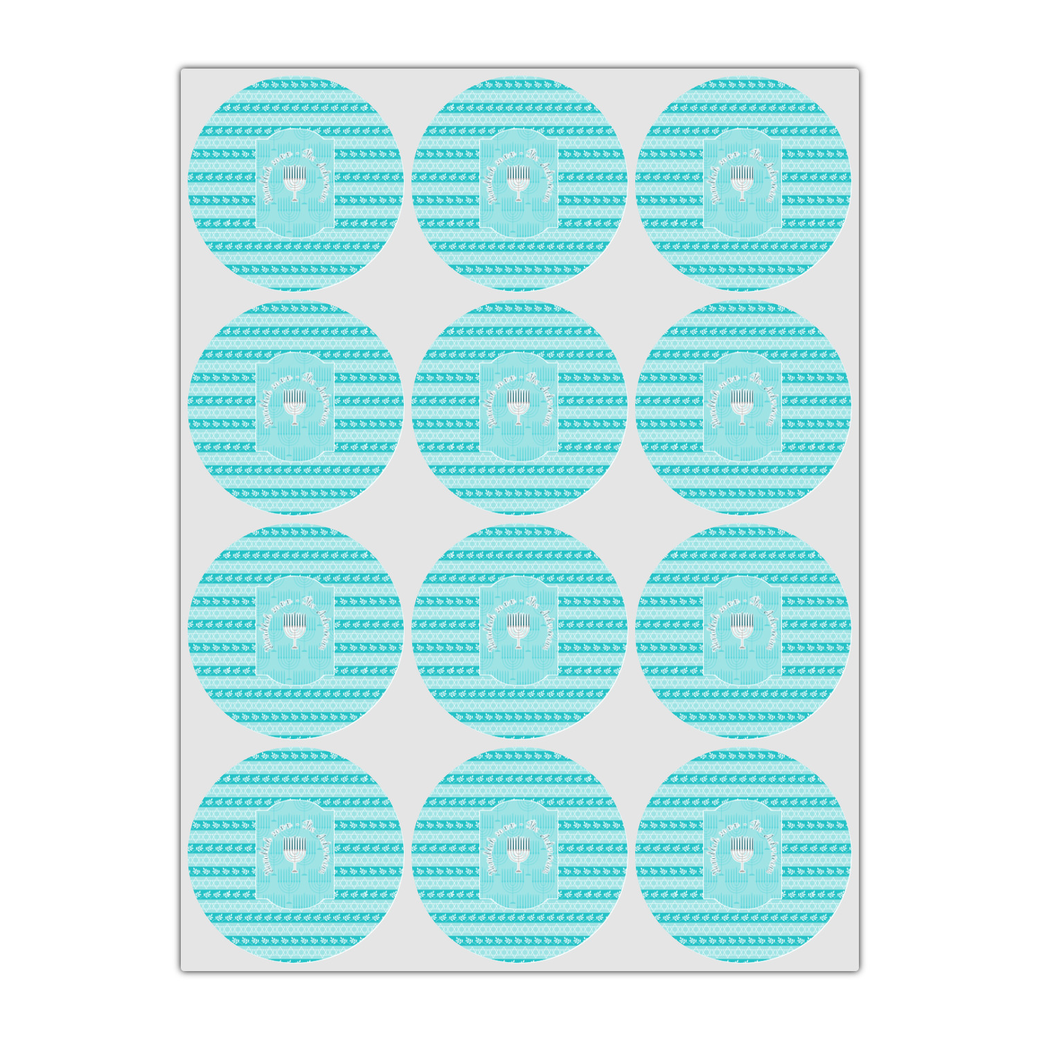 The design is a beautiful set of different shades of teal. You will see three different patterns used throughout this design. One with stripes, olive branches, and stars of David, one with menoras, and the last with doves, menoras, olive branches, and stars of David. The main design has a tall frame with your personalization and a menora graphic in the middle.