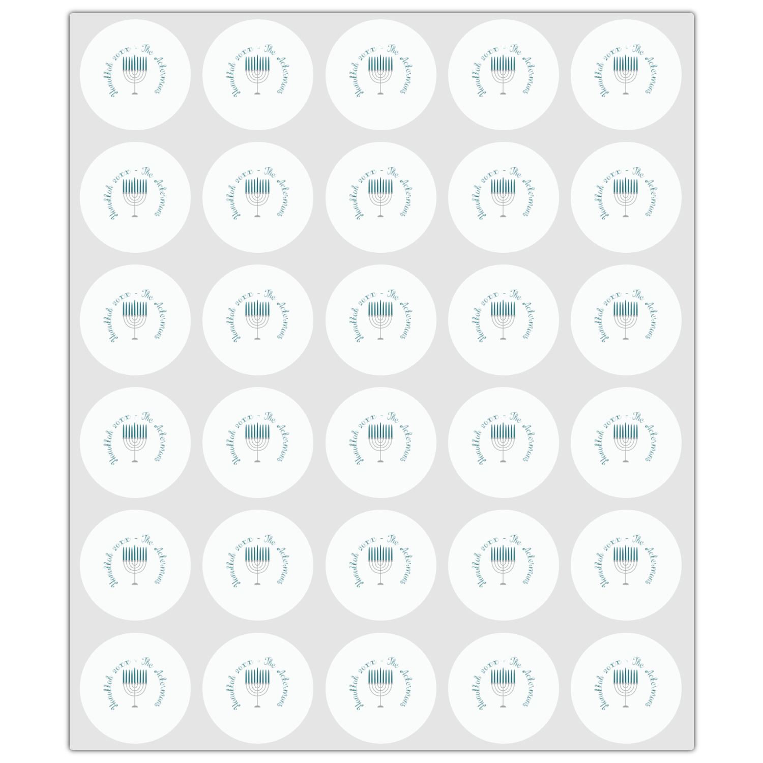 The design is a beautiful set of different shades of teal. You will see three different patterns used throughout this design. One with stripes, olive branches, and stars of David, one with menoras, and the last with doves, menoras, olive branches, and stars of David. The main design has a tall frame with your personalization and a menora graphic in the middle.