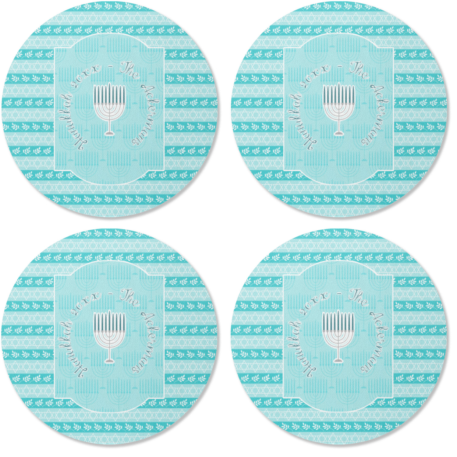 The design is a beautiful set of different shades of teal. You will see three different patterns used throughout this design. One with stripes, olive branches, and stars of David, one with menoras, and the last with doves, menoras, olive branches, and stars of David. The main design has a tall frame with your personalization and a menora graphic in the middle.
