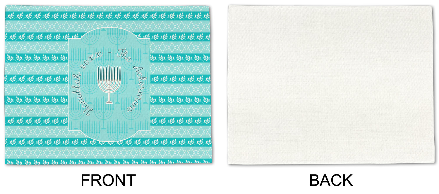 The design is a beautiful set of different shades of teal. You will see three different patterns used throughout this design. One with stripes, olive branches, and stars of David, one with menoras, and the last with doves, menoras, olive branches, and stars of David. The main design has a tall frame with your personalization and a menora graphic in the middle.