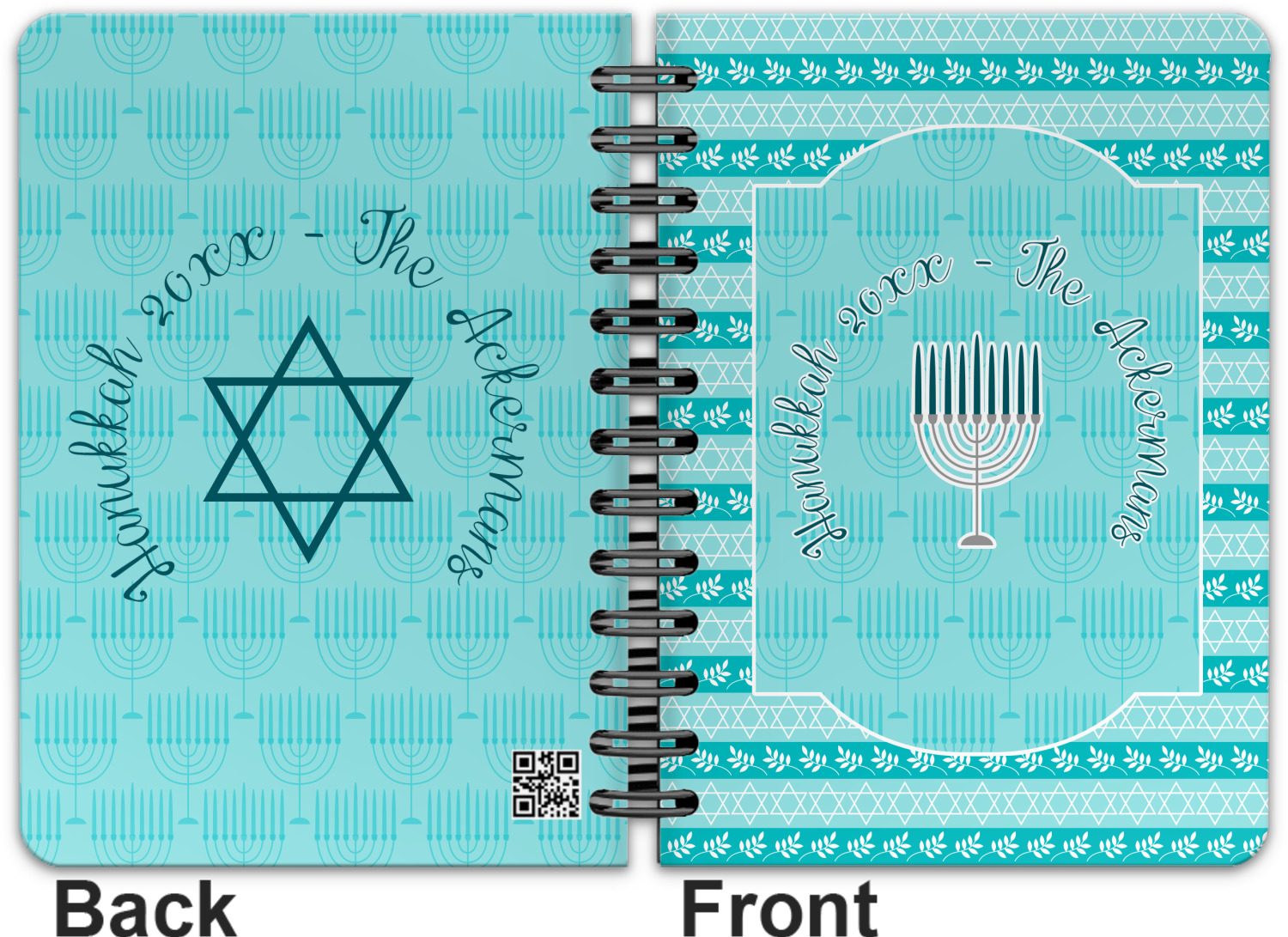 The design is a beautiful set of different shades of teal. You will see three different patterns used throughout this design. One with stripes, olive branches, and stars of David, one with menoras, and the last with doves, menoras, olive branches, and stars of David. The main design has a tall frame with your personalization and a menora graphic in the middle.
