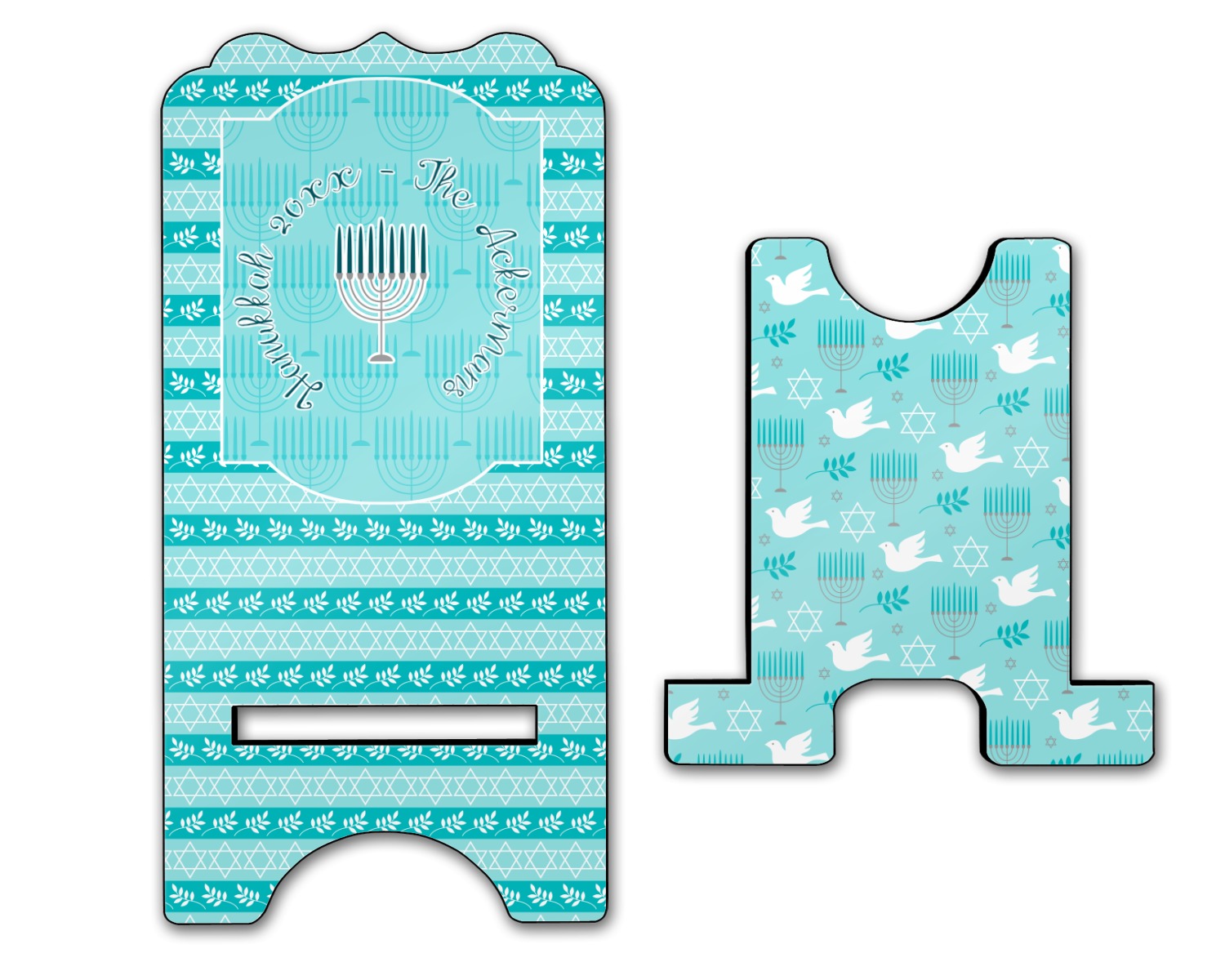 The design is a beautiful set of different shades of teal. You will see three different patterns used throughout this design. One with stripes, olive branches, and stars of David, one with menoras, and the last with doves, menoras, olive branches, and stars of David. The main design has a tall frame with your personalization and a menora graphic in the middle.
