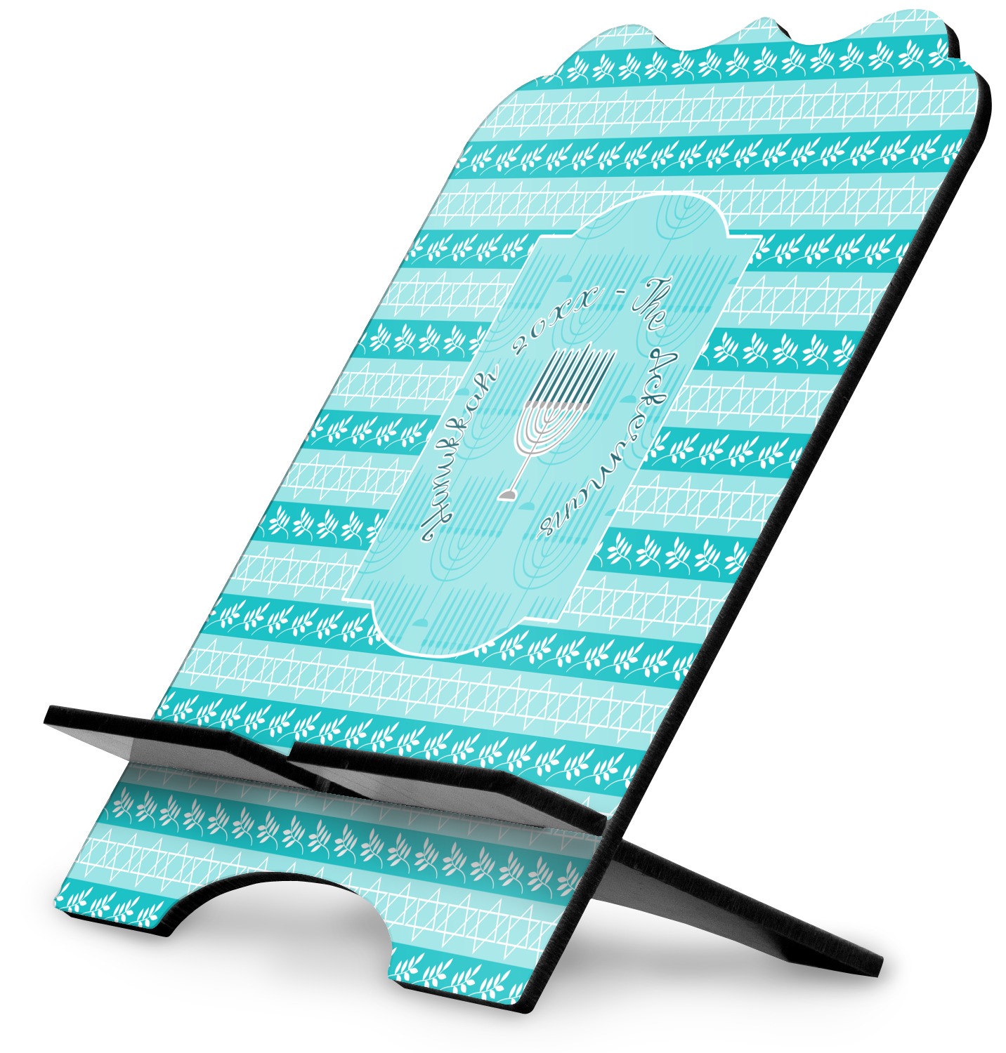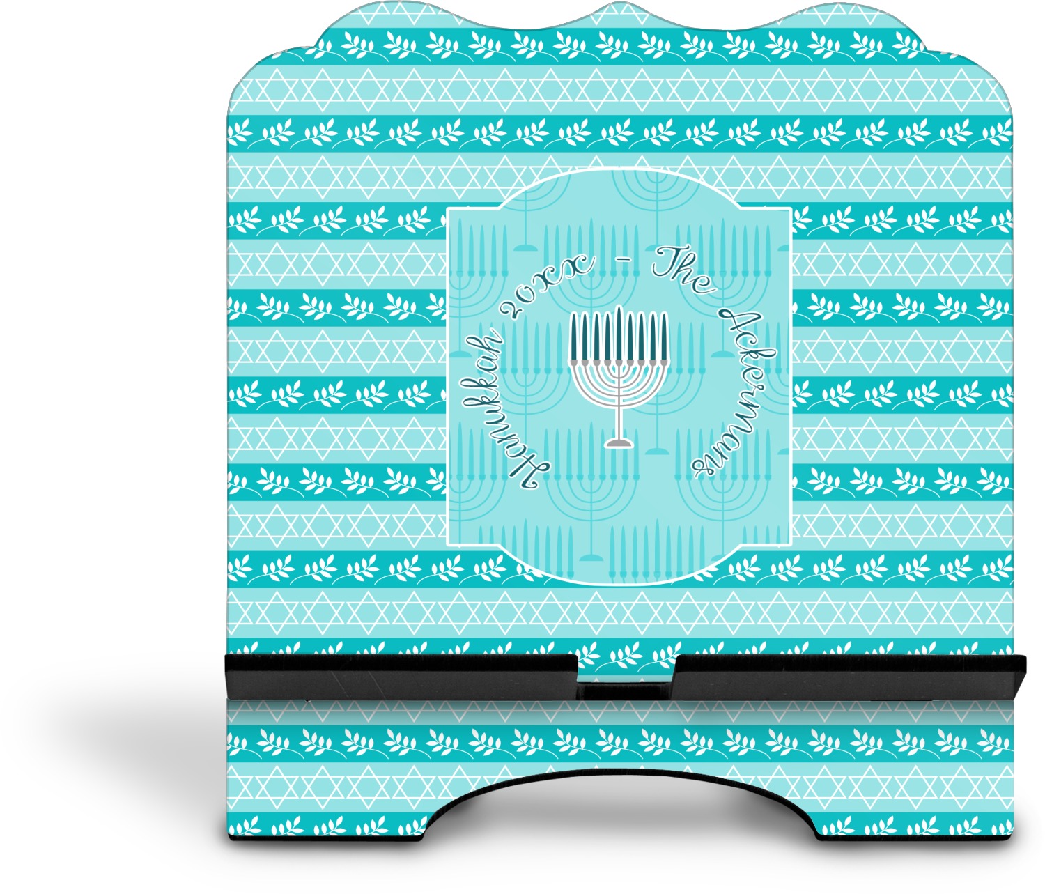 The design is a beautiful set of different shades of teal. You will see three different patterns used throughout this design. One with stripes, olive branches, and stars of David, one with menoras, and the last with doves, menoras, olive branches, and stars of David. The main design has a tall frame with your personalization and a menora graphic in the middle.