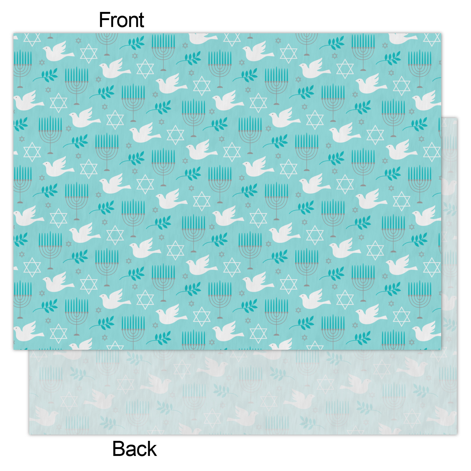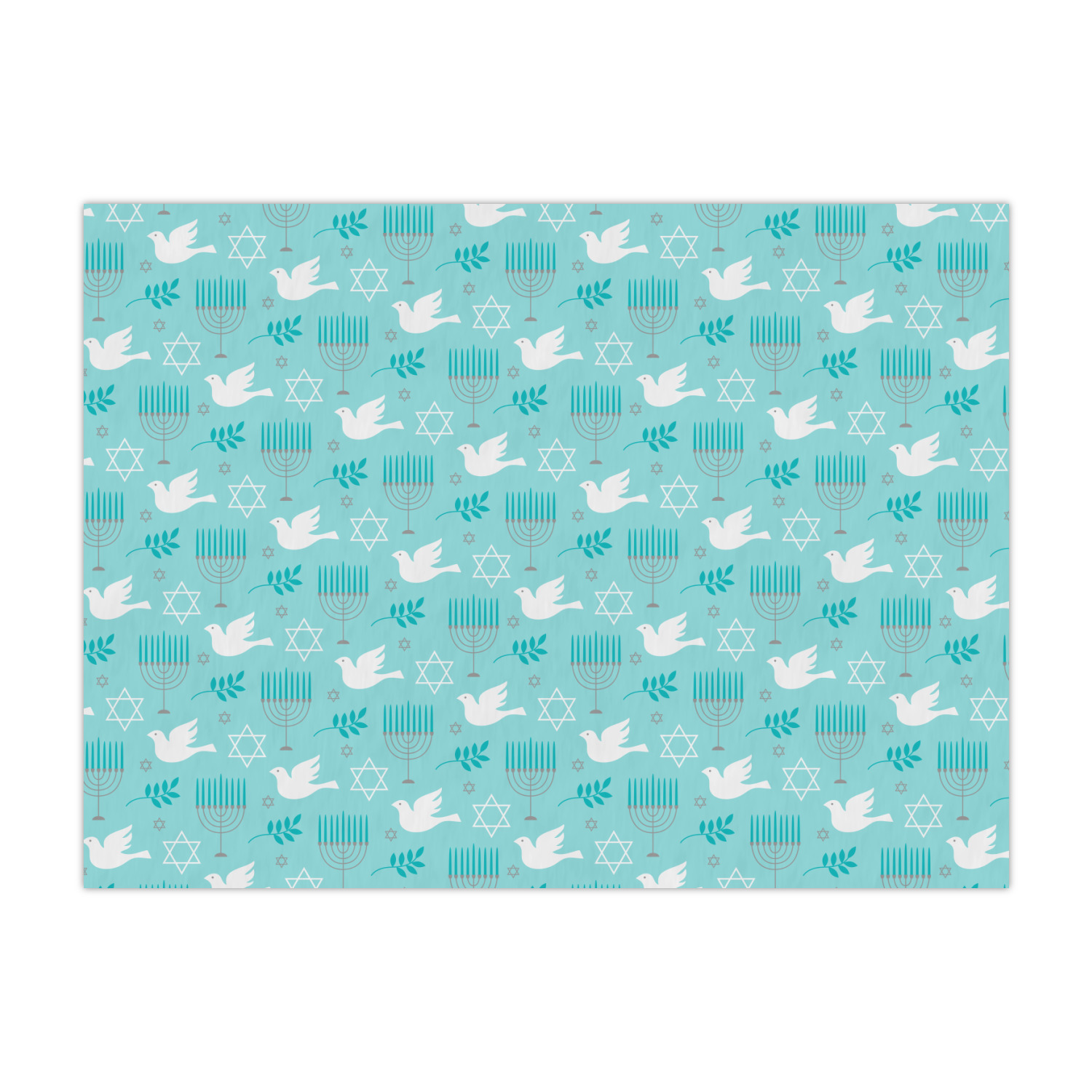 The design is a beautiful set of different shades of teal. You will see three different patterns used throughout this design. One with stripes, olive branches, and stars of David, one with menoras, and the last with doves, menoras, olive branches, and stars of David. The main design has a tall frame with your personalization and a menora graphic in the middle.
