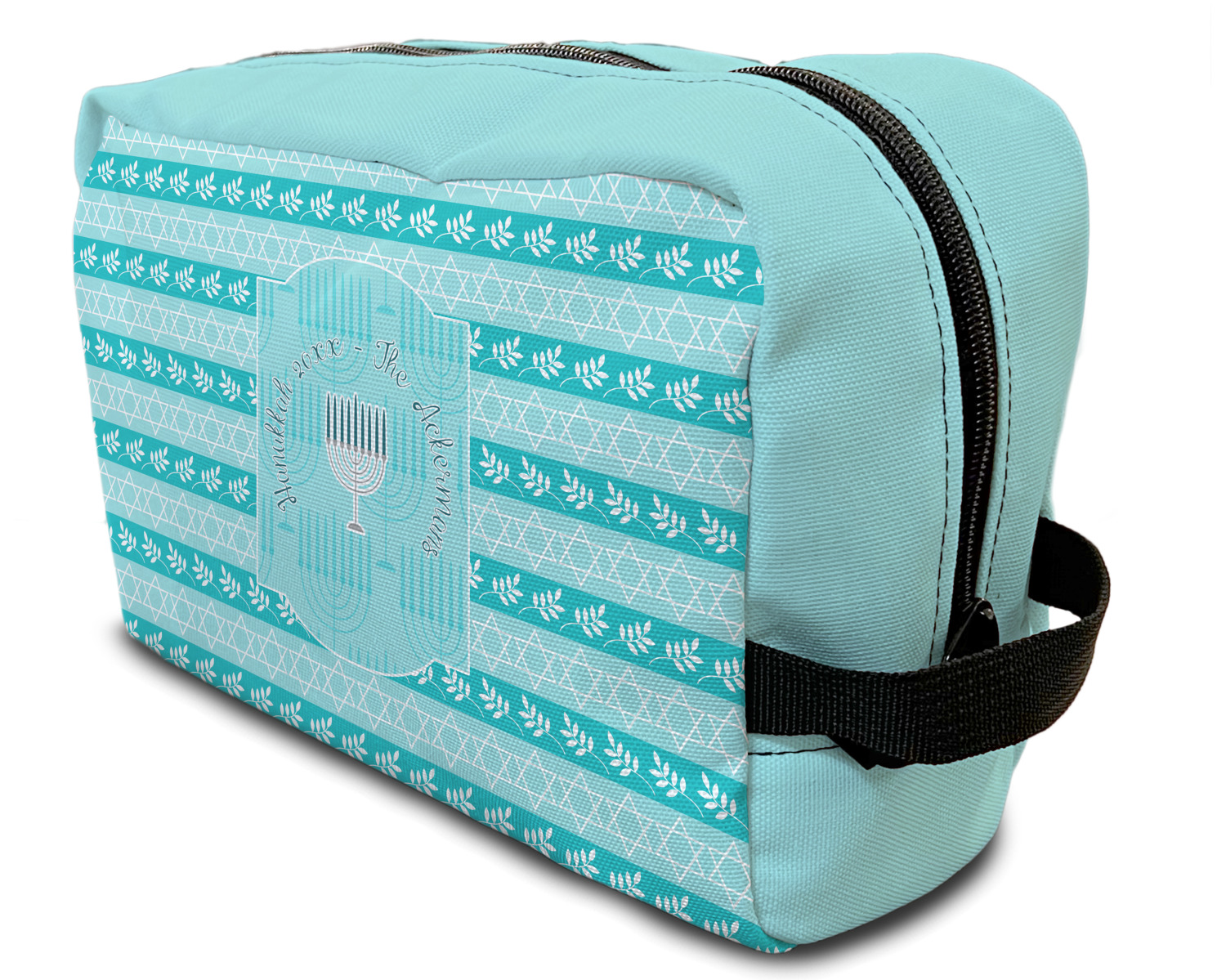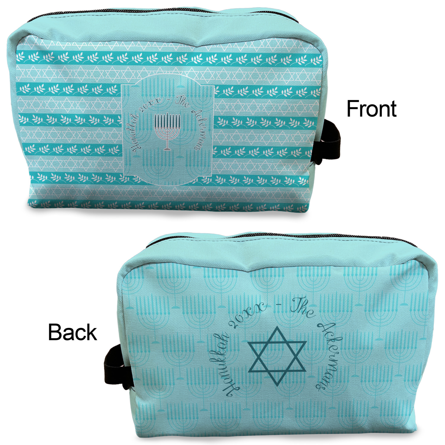 The design is a beautiful set of different shades of teal. You will see three different patterns used throughout this design. One with stripes, olive branches, and stars of David, one with menoras, and the last with doves, menoras, olive branches, and stars of David. The main design has a tall frame with your personalization and a menora graphic in the middle.
