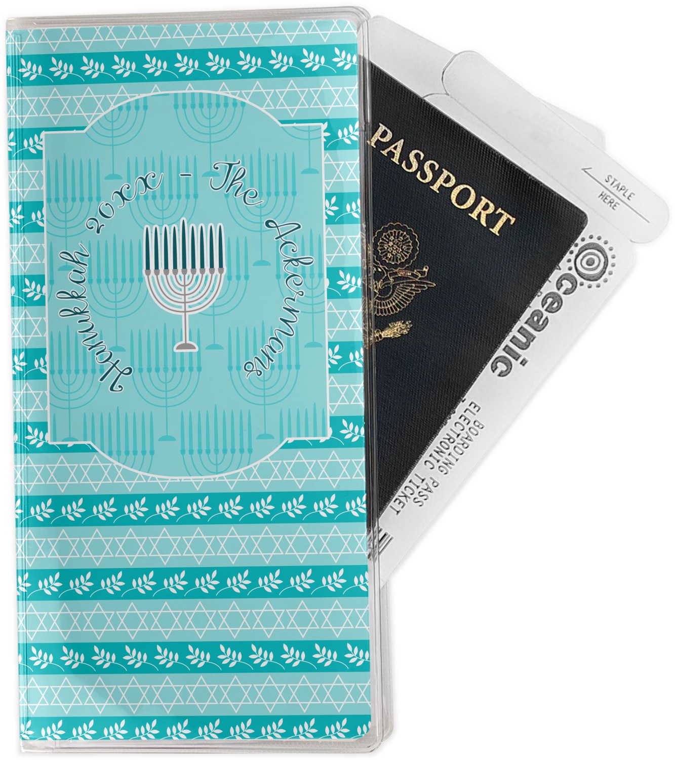 The design is a beautiful set of different shades of teal. You will see three different patterns used throughout this design. One with stripes, olive branches, and stars of David, one with menoras, and the last with doves, menoras, olive branches, and stars of David. The main design has a tall frame with your personalization and a menora graphic in the middle.