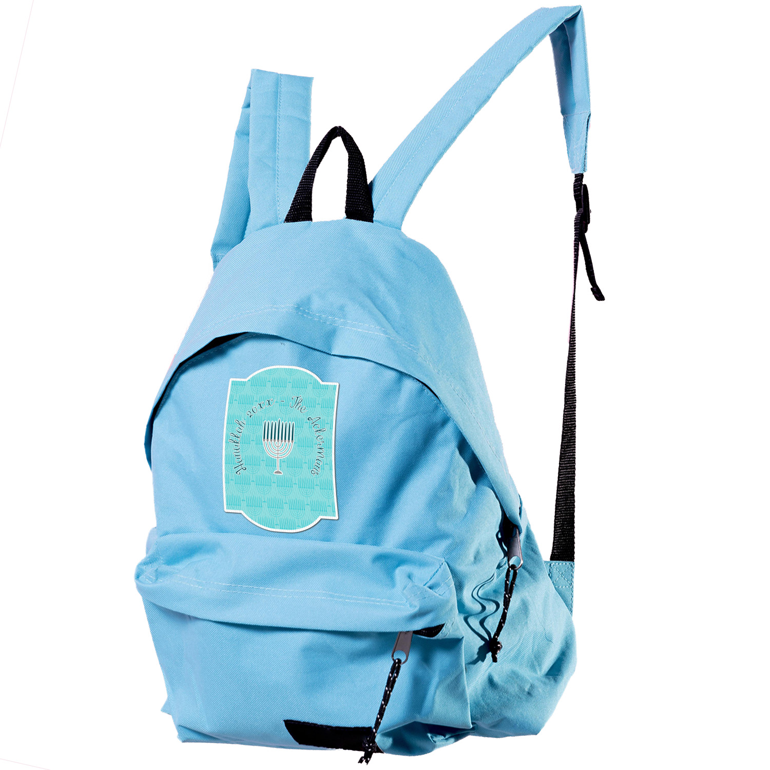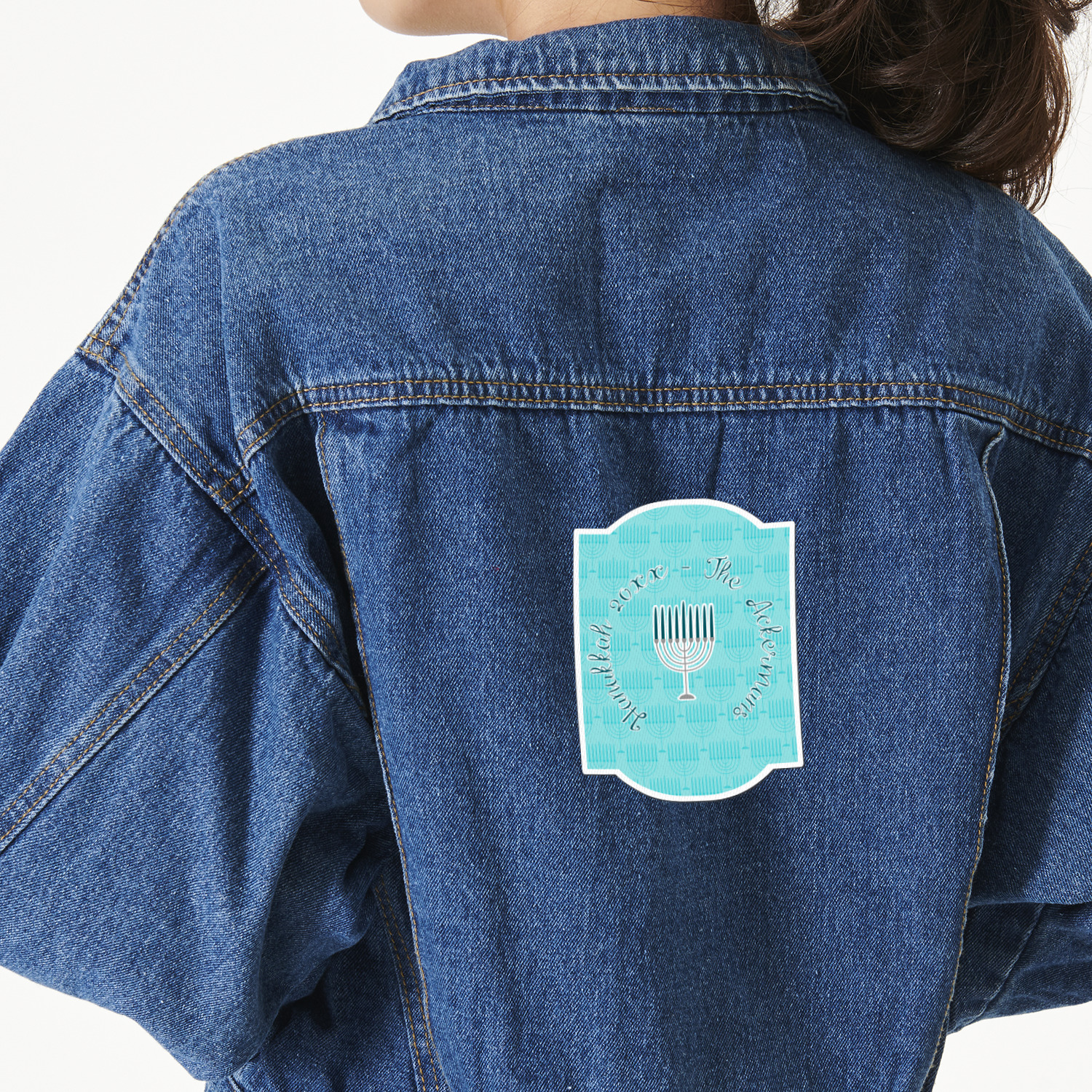 The design is a beautiful set of different shades of teal. You will see three different patterns used throughout this design. One with stripes, olive branches, and stars of David, one with menoras, and the last with doves, menoras, olive branches, and stars of David. The main design has a tall frame with your personalization and a menora graphic in the middle.