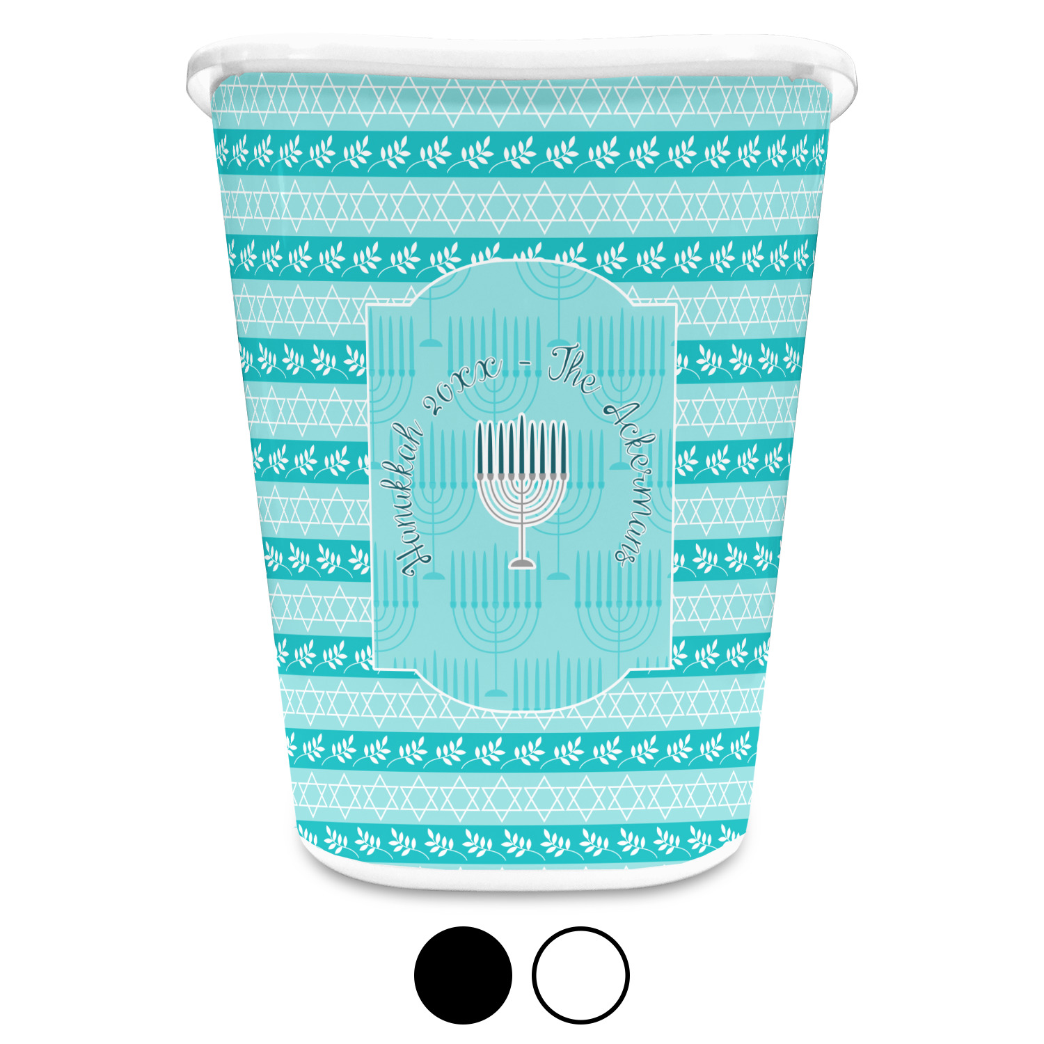 The design is a beautiful set of different shades of teal. You will see three different patterns used throughout this design. One with stripes, olive branches, and stars of David, one with menoras, and the last with doves, menoras, olive branches, and stars of David. The main design has a tall frame with your personalization and a menora graphic in the middle.