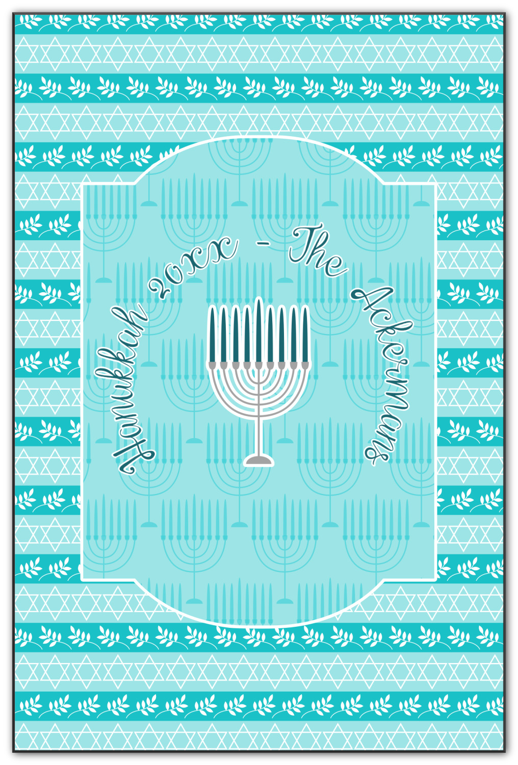 The design is a beautiful set of different shades of teal. You will see three different patterns used throughout this design. One with stripes, olive branches, and stars of David, one with menoras, and the last with doves, menoras, olive branches, and stars of David. The main design has a tall frame with your personalization and a menora graphic in the middle.
