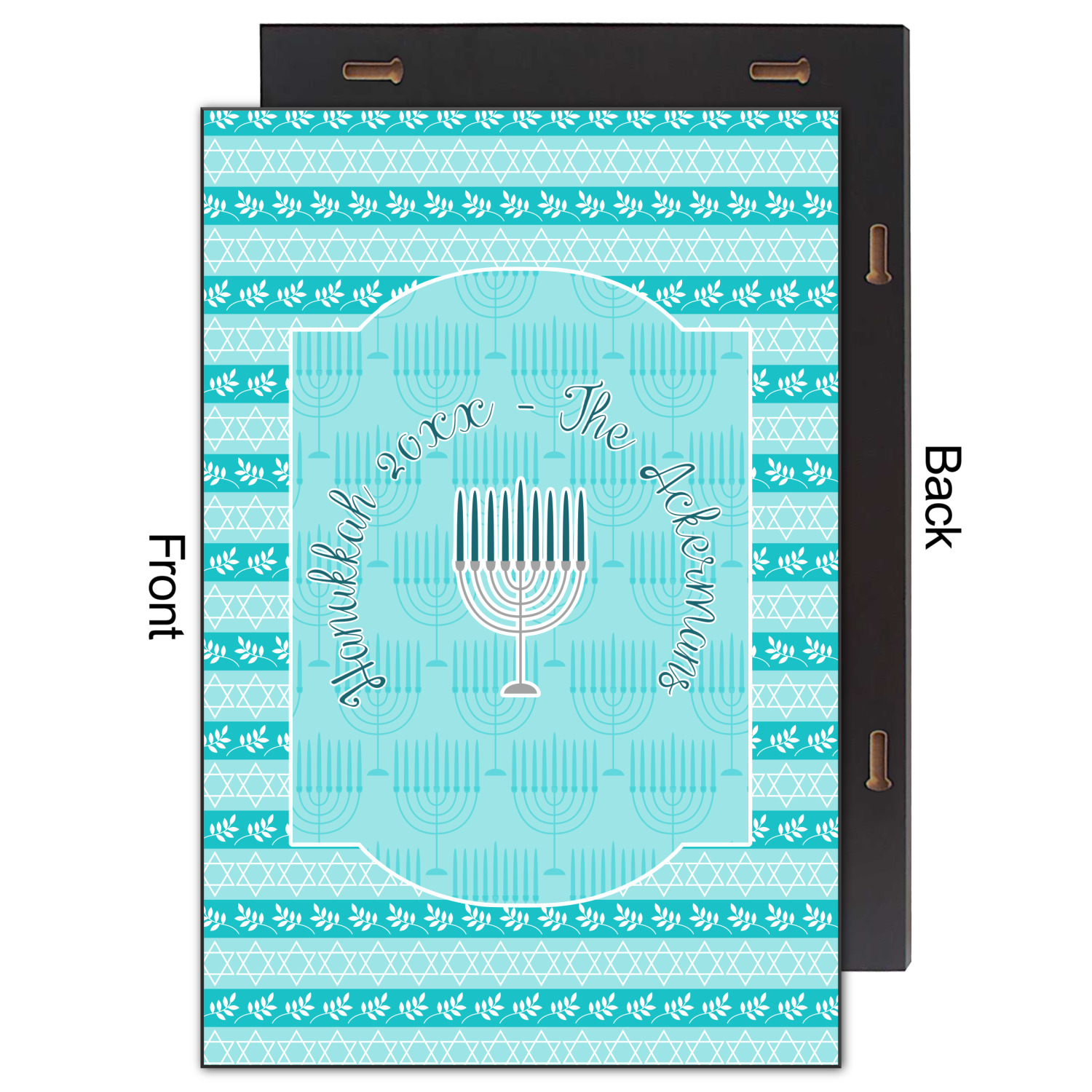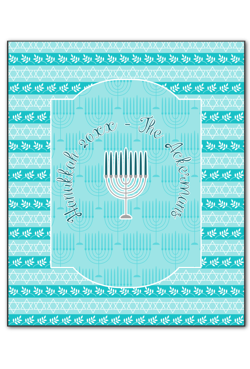 The design is a beautiful set of different shades of teal. You will see three different patterns used throughout this design. One with stripes, olive branches, and stars of David, one with menoras, and the last with doves, menoras, olive branches, and stars of David. The main design has a tall frame with your personalization and a menora graphic in the middle.